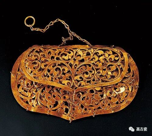 香囊自古为佩于身或悬于床帐或车辇上的饰物。此香囊呈扁桃形,镂刻花纹、缠枝忍冬纹也有明显的唐代金银器的余韵。契丹建国辽之时正是唐代末年,积淀深厚的唐文化几乎渗透到其政治、经济、军事、科技和文化等各个领域,辽代金银器中的唐代遗风正是反映出这一历史事实。