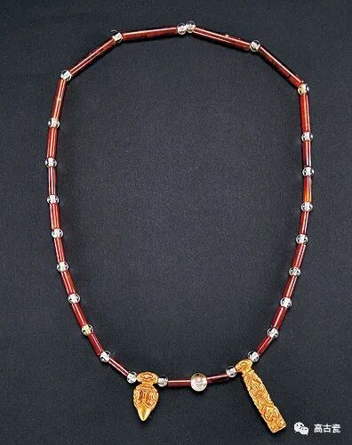 项饰。璎珞一般以金玉珠宝穿缀而成,故古代又称之为“珠璎珞”。该璎珞以玛瑙、水晶、心形和T形坠饰组成。玛瑙古称琼,又称赤玉。玛瑙一词出自佛经,梵语本称“阿斯玛加波”,意为“马脑”。水晶是一种无色透明的石英结晶体矿物,深受契丹人喜爱并以之制作饰物。而心形和T形的不对称组合,或寓意阴阳。北亚、西亚、中亚古代民族的一些项饰,有与之相似的装饰部件。契丹的此种坠饰,或与北方民族的传统装饰有关。其色彩和谐雅致,给人一种浑然天成之感。该墓主人为辽太祖耶律阿保机的堂弟、开国元勋耶律羽之,说明此类璎珞为契丹贵族所用。
