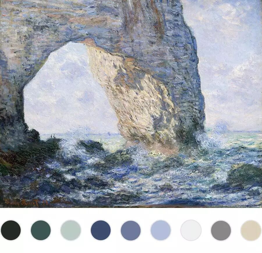 这幅画,也是莫奈所画,埃特尔塔的悬崖,画的内容不带任何情感,只是一个风景。但我们其实也可以通过颜色的选取和搭配,去听见莫奈心中的声音。