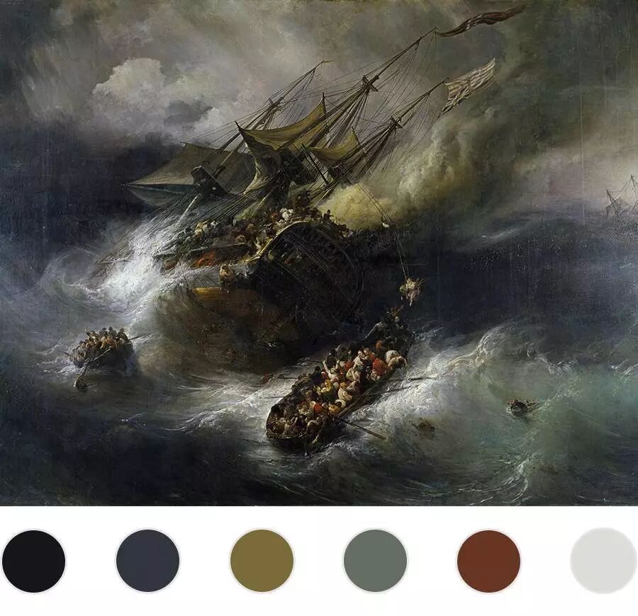同样,还是用之前的那个方法,用手遮住画,不去看画的内容,光是看这幅画的提取出来的颜色,都是能感受到那种凶险与压抑的。