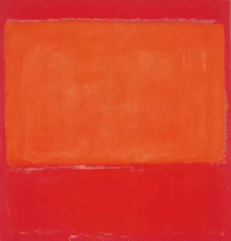 再举一个极端一点儿的例子,有个美国的抽象派画家,叫马克·罗斯科,他的很多画作,就是一种颜色的宣泄,利用颜色本身的能量,去传达作者的情感。而红色是罗斯科最爱的颜色,也许是红色所具备的力量感,正好是罗斯科所想传达的。