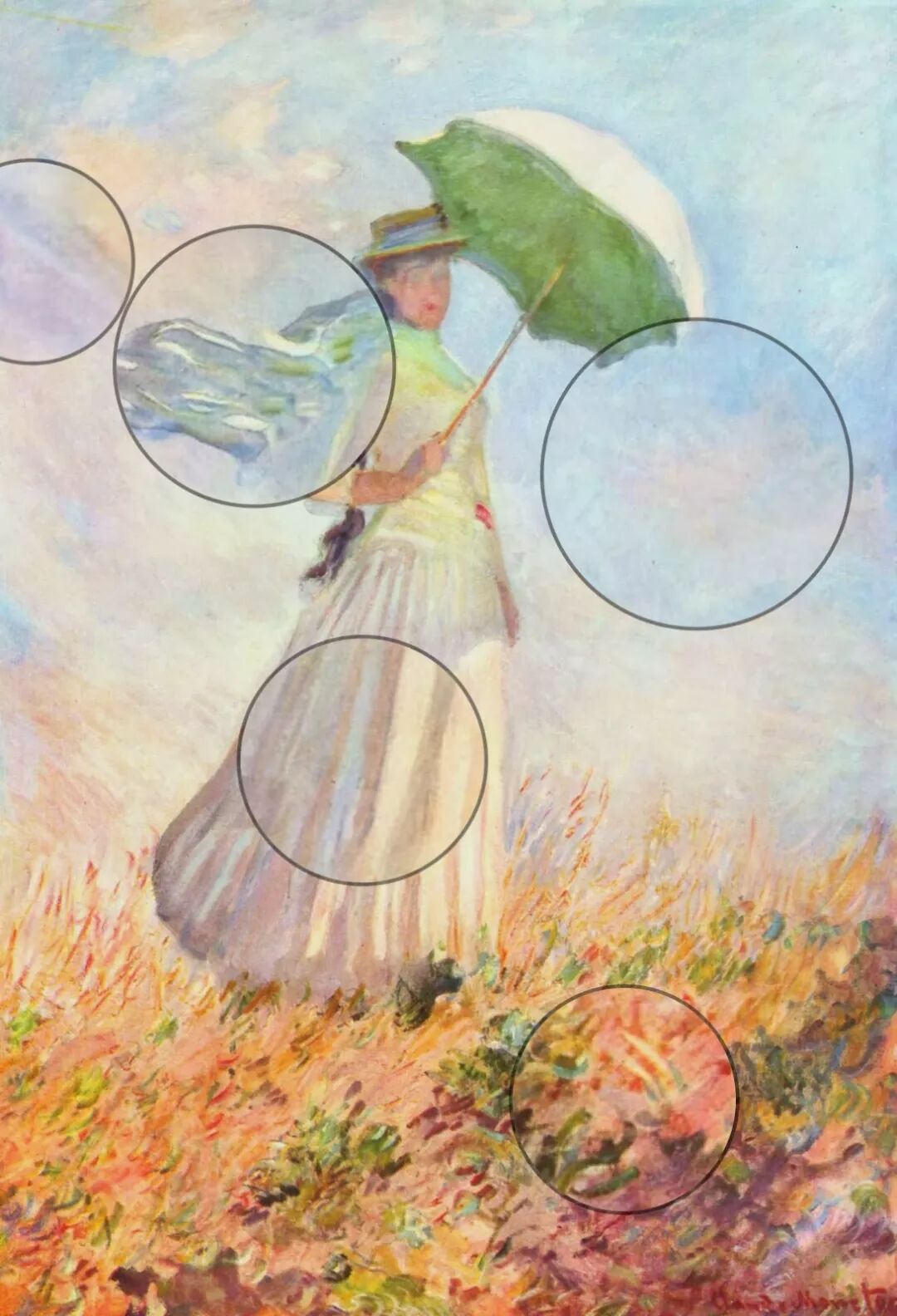 颜色在说话,颜色本身所具备的能量,帮助莫奈更好地在传达他的爱意和塑造莫奈妻子的形象。