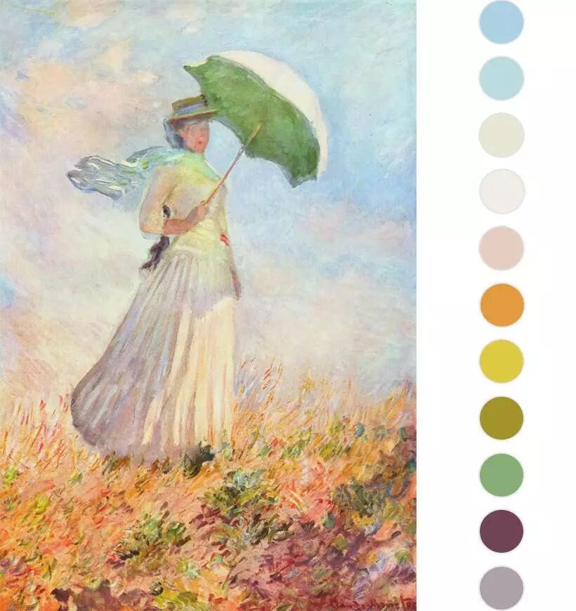 那是因为这幅画,莫奈所选用的主色调,是那种比白色,更灰更粉一点的,如傍晚时的流云——“流云白”。再配上,十分浪漫清新的蓝色和绿色,甚至于,底部草的颜色都选用的是浪漫清新的。