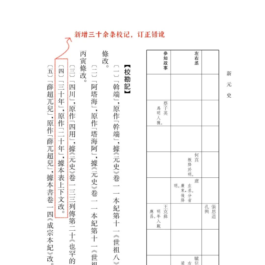 《新元史》在18年3月已出版过精装版,此次改为平装出版,主要做了以下工作:一是完善了目录,在列传部分增加了次级目录,标示出列传传主出现的页码,方便检索。二是订正了精装版中的一些文字、标点错误。三是增补了少量校记。