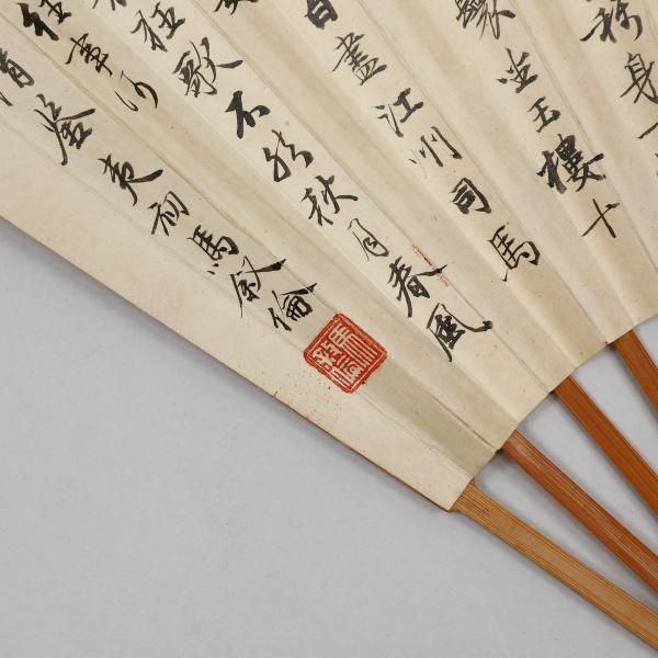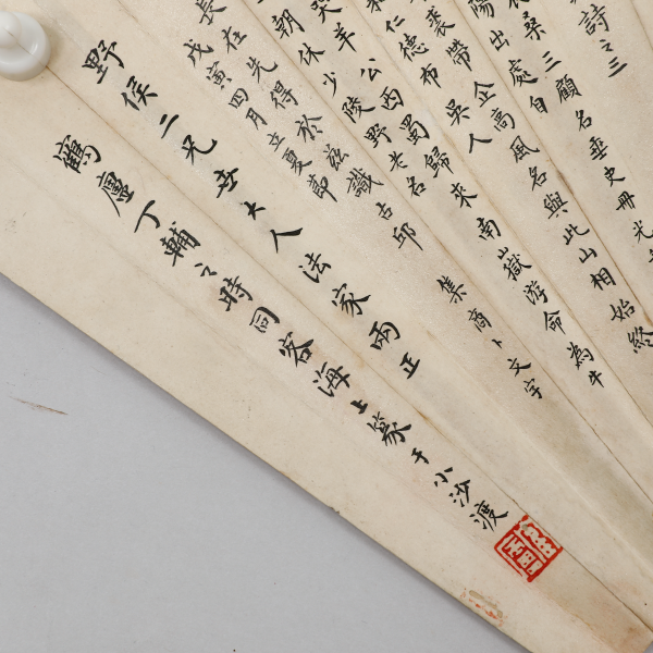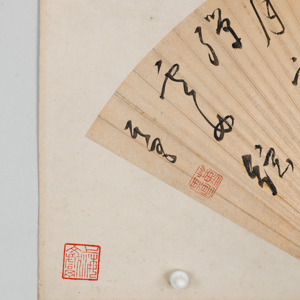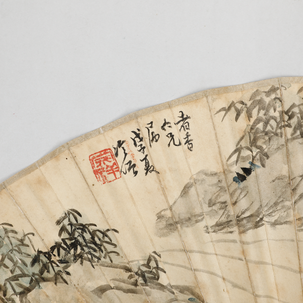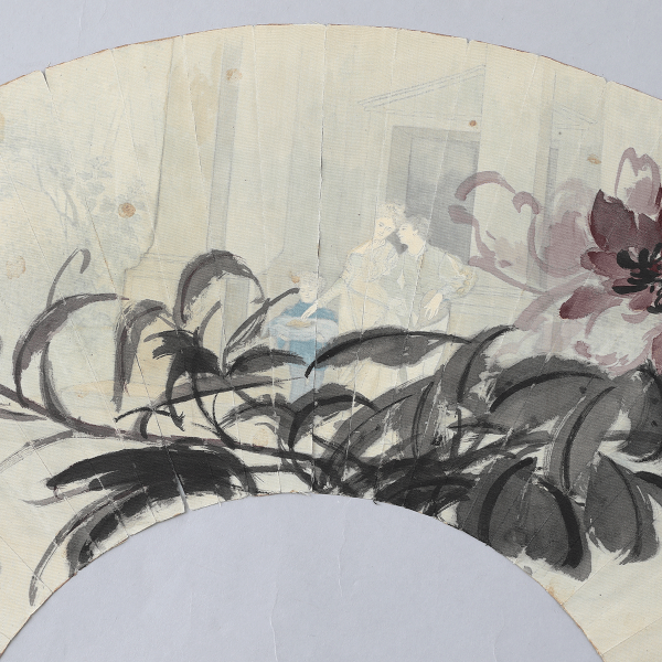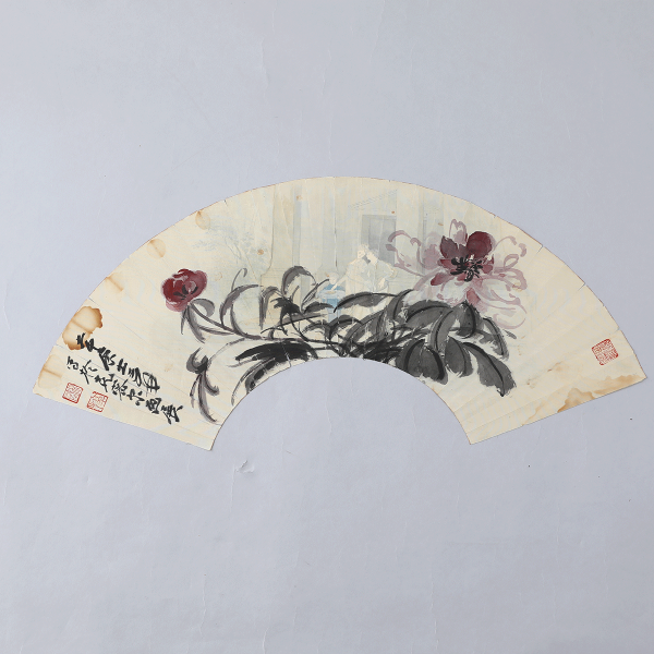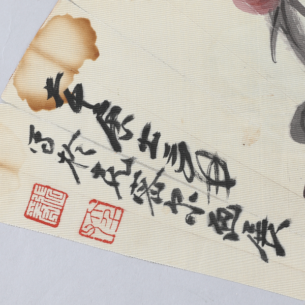 说明:附张大千为本拍品主人Luisa A winter作画的经过说明及照片。译文如下:1967年8月底,我和丈夫在加利福尼亚卡梅尓度假。行至圣卡洛斯大街时,我们看到了张大千艺术展。我很喜欢他的作品。那时正值夏季,我随身带有一把鹅毛扇,扇背面空白,因此我请张大千为我在扇面上作画。他应允了并为我签名。我十分高兴。Luisa A winter.