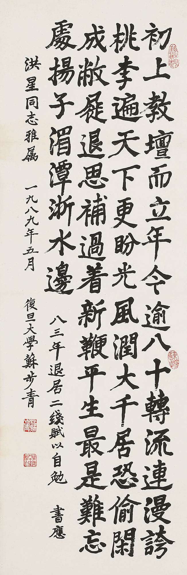 上款简介:苏步青(1902~2003),原名苏尚龙。浙江省平阳县人。著名数学家。曾任中国科学院学部委员、多届全国政协委员、全国人大代表,第五、第六届全国人大常委会委员,第七、第八届全国政协副主席和民盟中央副主席等职。