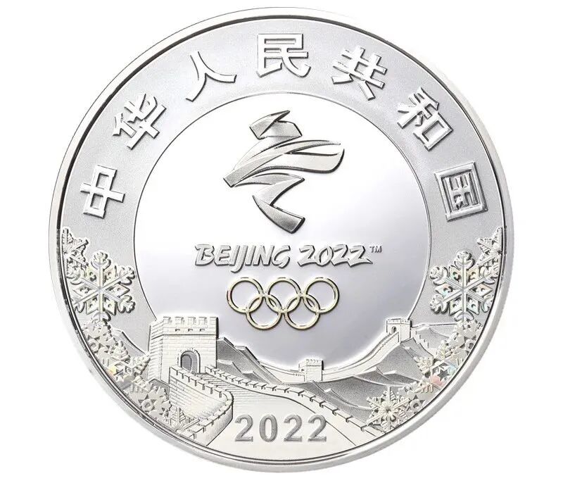 1公斤圆形银质纪念币背面图案为冬季奥林匹克运动会运动项目——高山滑雪、越野滑雪、单板滑雪、跳台滑雪等运动造型,衬以长城、国家跳台滑雪中心、首钢滑雪大跳台等元素组合设计,并刊“第24届冬季奥林匹克运动会”字样及面额。