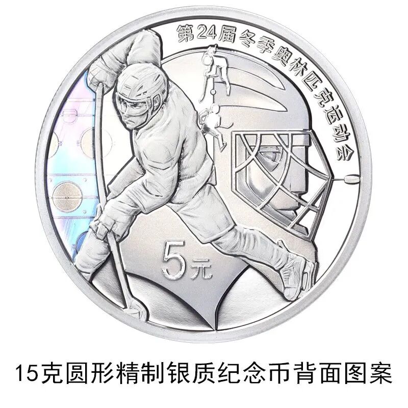 15克圆形银质纪念币背面图案为冬季奥林匹克运动会运动项目——冰球运动造型,衬以装饰风格的运动竞技场景等元素组合设计,并刊“第24届冬季奥林匹克运动会”字样及面额。