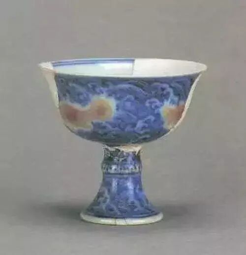 明永乐 青花釉里红海浪三鱼纹高足杯