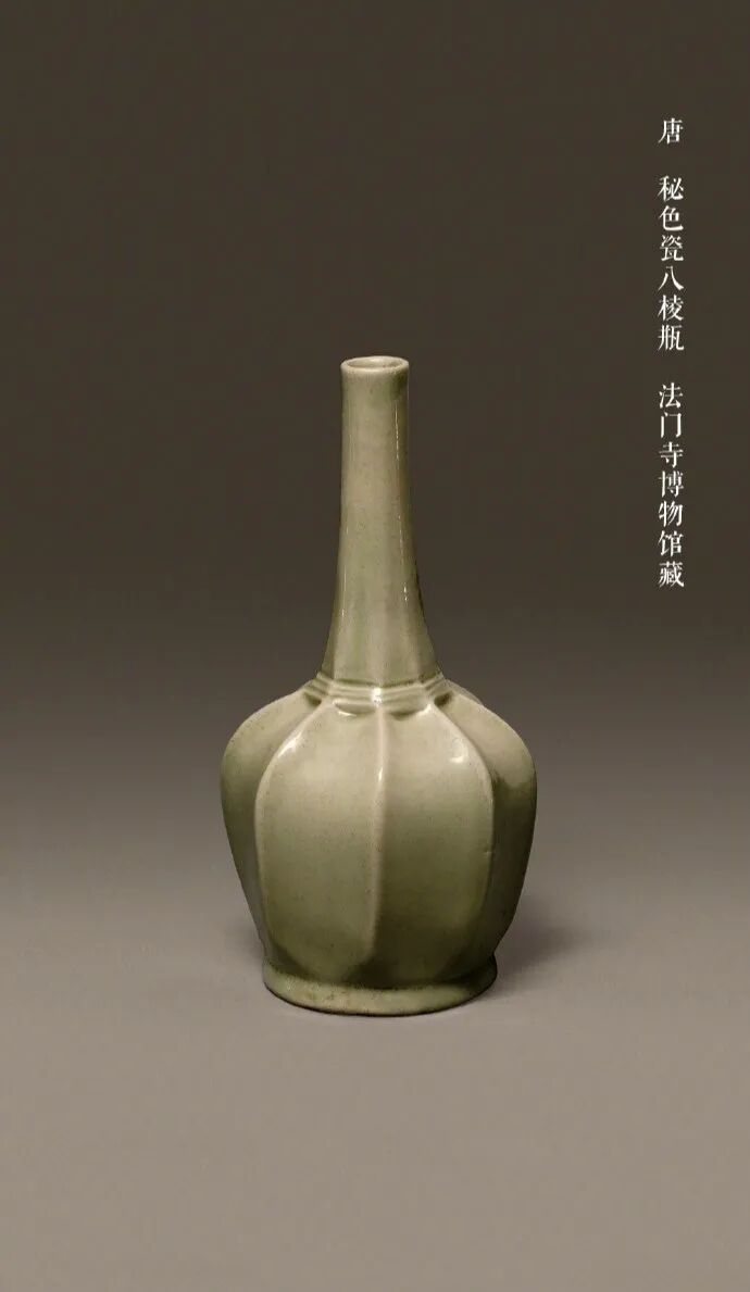 1987年陕西扶风法门寺唐代地宫出土了一件越窑青釉八棱瓶秘色瓷,这是典型的八棱瓶。它的用途在唐代就是我们前面提到的净瓶。瓶的形制特点是通体呈八棱形。