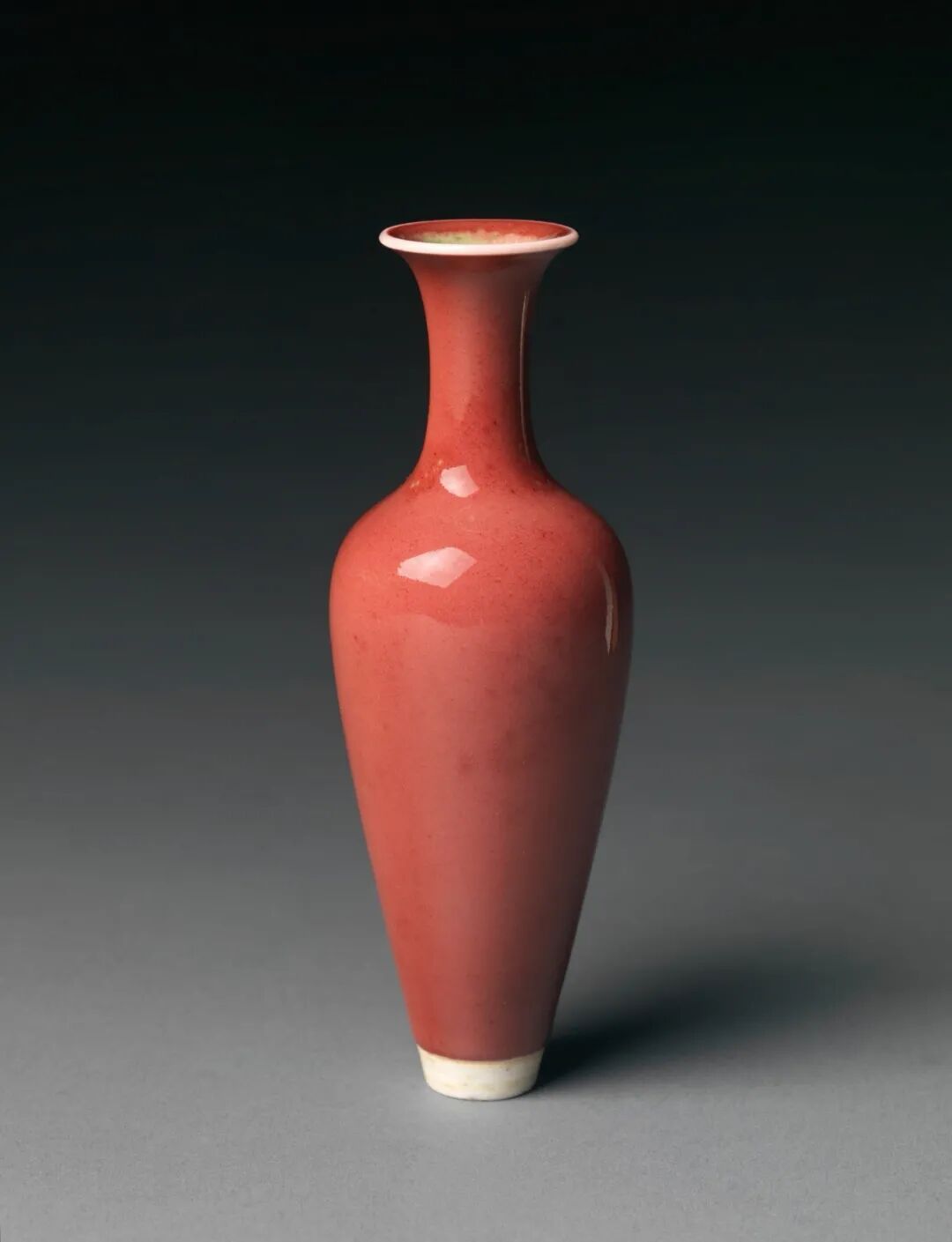 柳叶瓶器型为撇口,短颈,丰肩,肩下削瘦至足,足内凹,器身细长,因为形状像一片柳叶而得名,又因为像美人的肩膀,故又被称为"美人肩"。是清代康熙景德镇窑创制,康熙豇豆红釉柳叶瓶,是极为珍贵的产品。