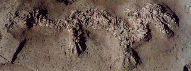 仰韶文化遗址的墓室中,静卧着一条由贝壳组成的“蚌塑龙”,张嘴伸舌、昂首弓背,似乎准备着重见天日时翱翔九天。