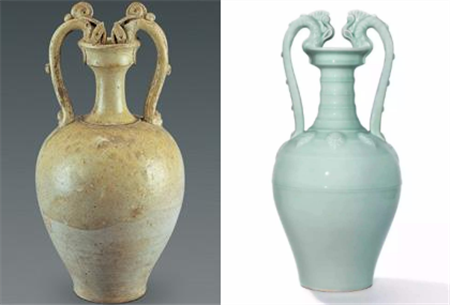 唐代白釉双龙柄壶与雍正粉青双龙柄壶