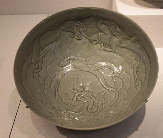 下图越窑青瓷龙纹碗,在小小的方寸之地刻画三龙,首尾相接、团身昂首,神采飞扬。