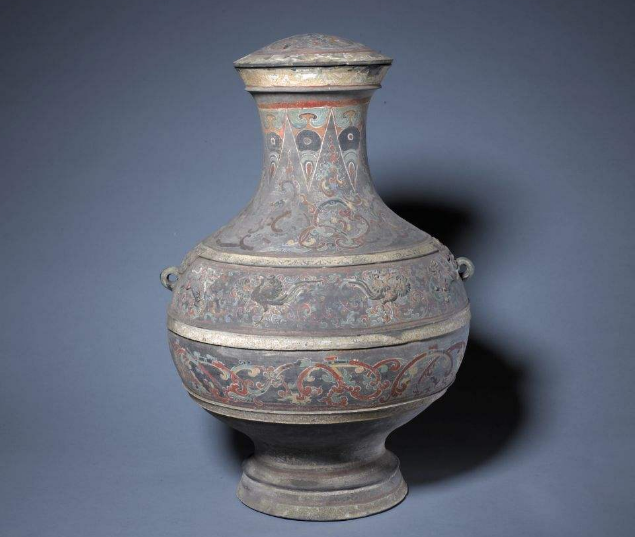 下图西汉凸雕龙凤纹彩绘陶壶,腹部凸雕青龙、朱雀,画面色彩明艳,云气蒸腾,非常难得。