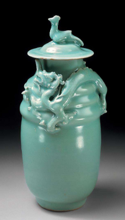 如下图龙泉窑堆塑龙纹盖瓶,一条小龙盘绕于瓶颈,呈现出融入了江南烟雨的暧昧梅子青,一副游山玩水的天真模样。