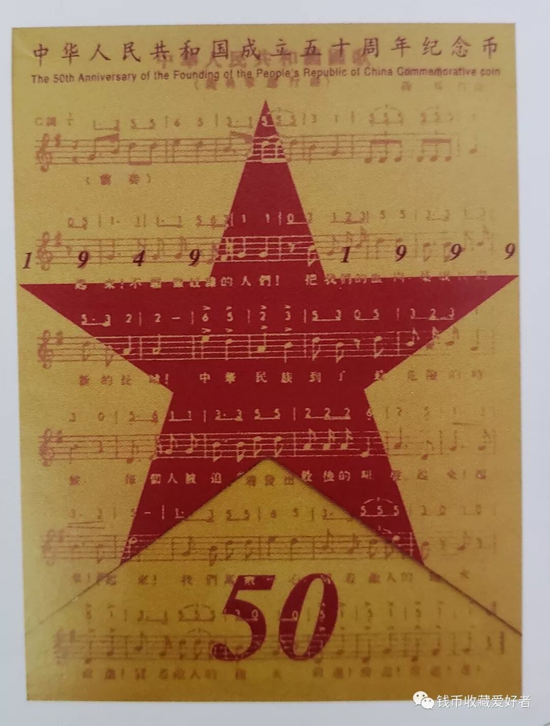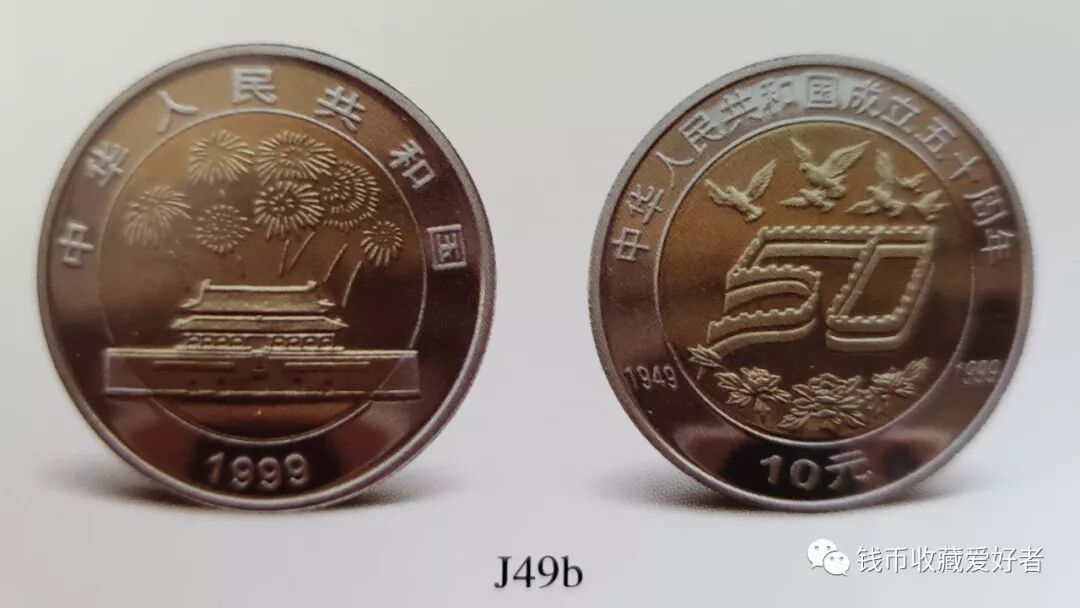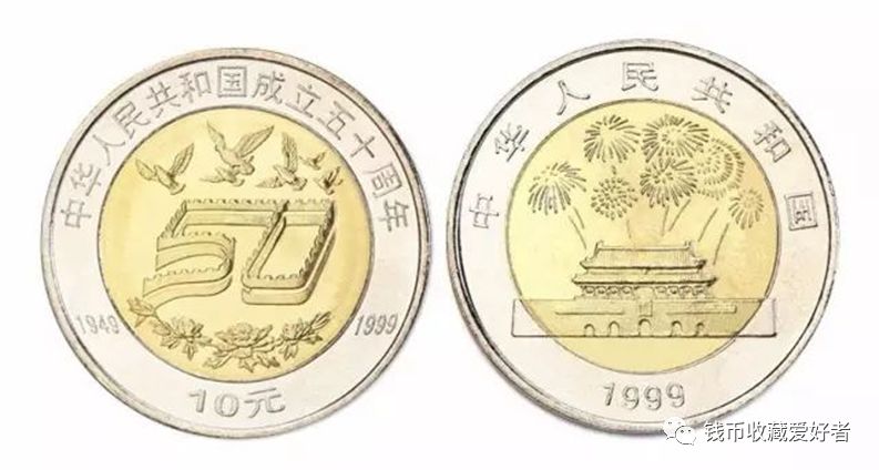 1999年中华人民共和国成立五十周年纪念币为黄铜合金和白铜合金双色镶嵌,直径25.5MM,重7.8克,发行量1000万,采用间断丝齿防伪。