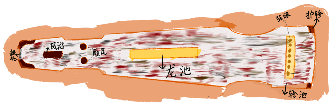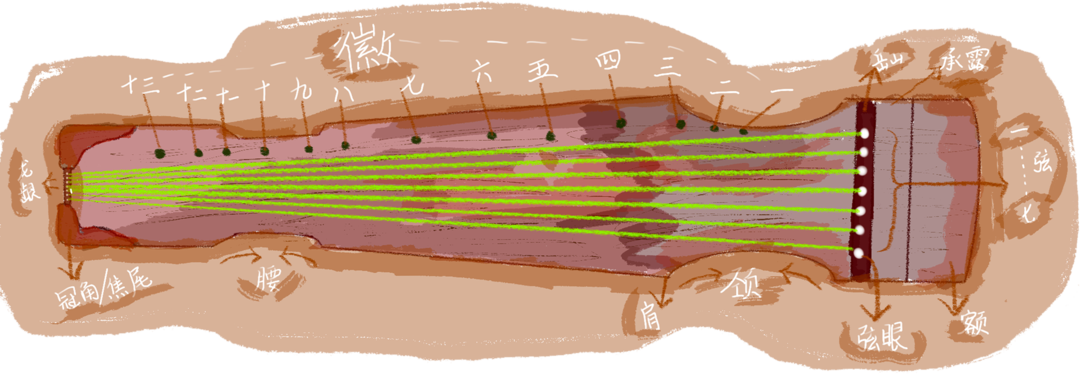 在1300多年的漫长岁月里,因为弹奏的震动以及冷热干湿变化,古琴的漆面上产生了很多细小的断纹,琴背断纹基本是小流水断纹和牛毛断之间,还有部分冰纹断,以致琴身斑驳,古朴沧桑。