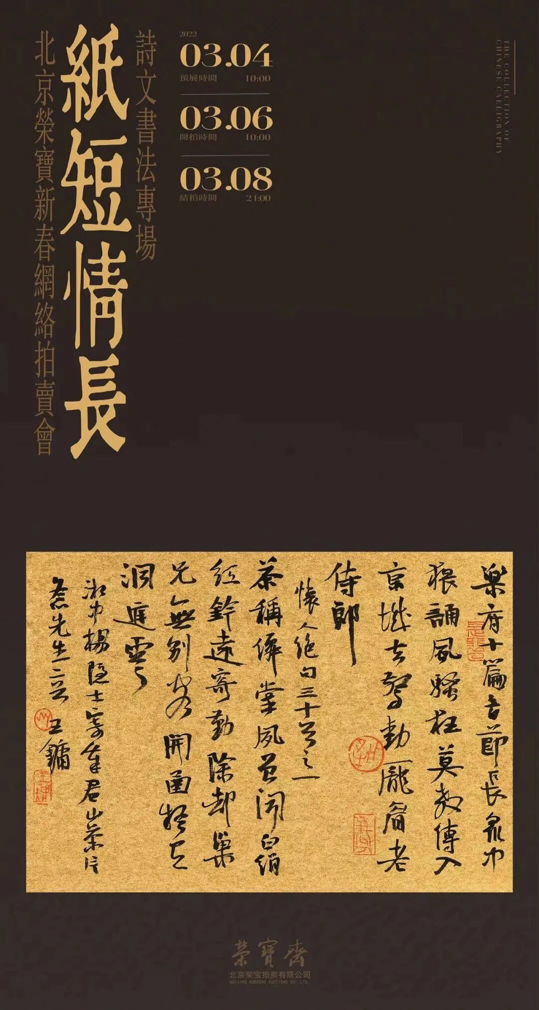 北京荣宝新春网络拍卖会——纸短情长·诗文书法专场将于3月4日10:00—3月6日10:00开启线上预展,并于3月6日10:00开拍,3月8日21:00结拍。
