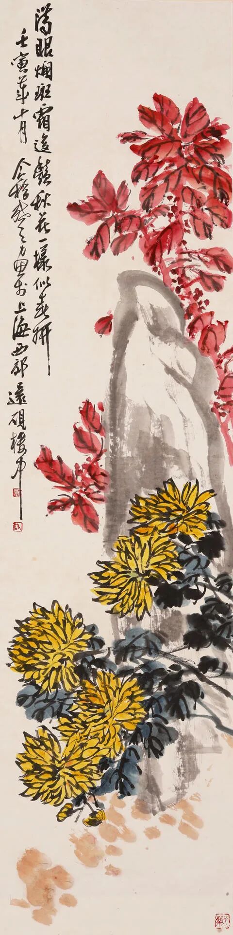 题识:满眼烂斑霜逡艳,秋花一样似春妍。壬寅岁十月,个簃启之画于上海西郊远砚楼中。