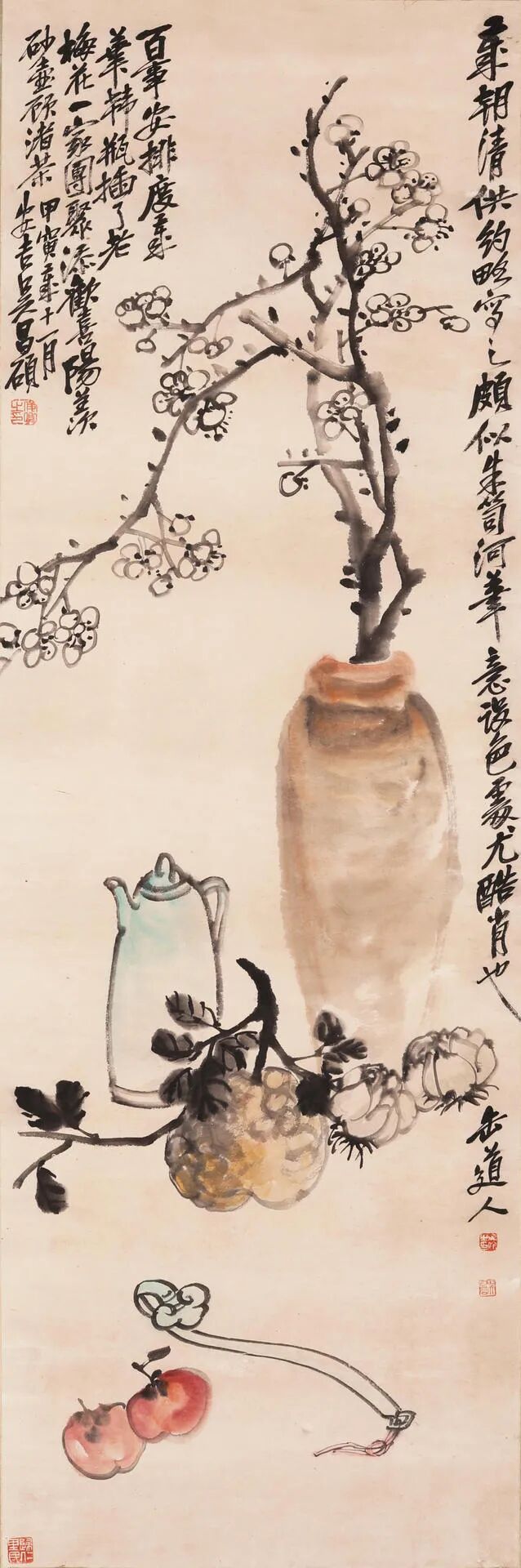 1.岁朝清供,约略写之,颇似朱笥河笔意,设色处尤酷肖也,缶道人。