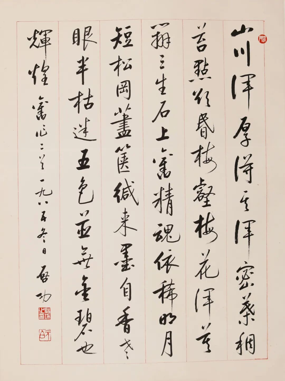 题识:山川浑厚得其浑,密叶稠苔点欲昏。梅壑梅花浑莫辨,三生石上旧精魂。依稀明月短松冈,荩箧缄来墨自香。老眼半枯迷五色,并无金碧也辉煌。旧作二首,一九八五冬日,启功。