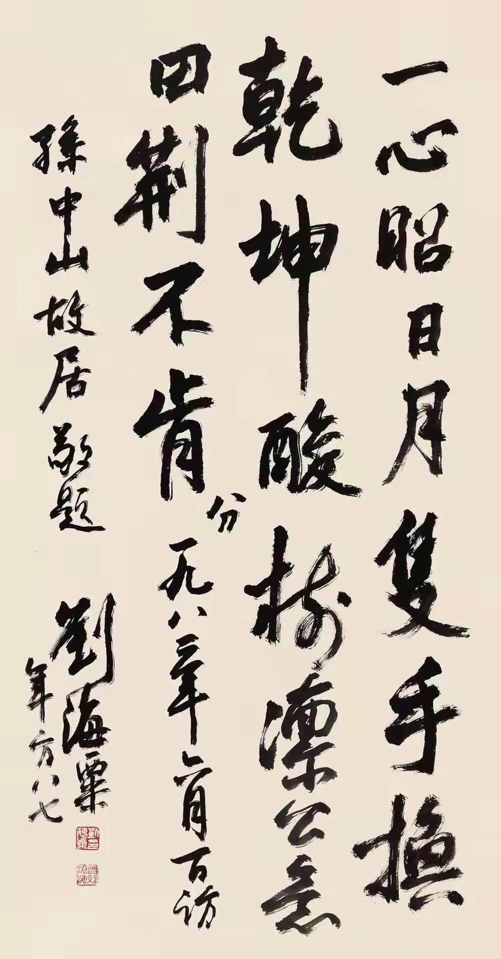 题识:一心昭日月,只手换乾坤。酸树凛公志,田荆不肯分。一九八三年六月一日访孙中山故居敬题。刘海粟年方八七。