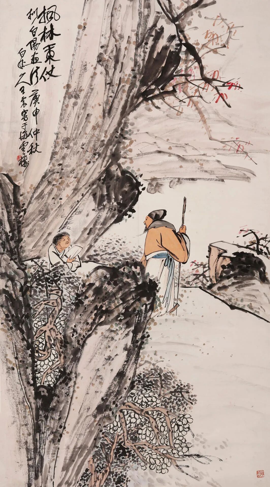 题识:枫林策杖。拟白阳画法,庚申仲秋白龙山人王震写于海云楼。