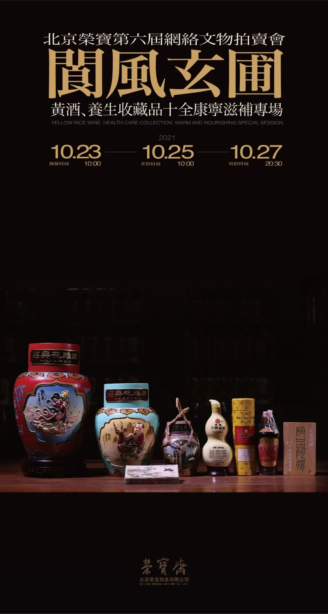 北京荣宝第六届网络文物拍卖会——阆风玄圃·黄酒、养生收藏品 十全康宁滋补专场将于10月23日10:00—10月25日10:00开启线上预展,并于10月25日10:00开拍,10月27日20:30结拍。