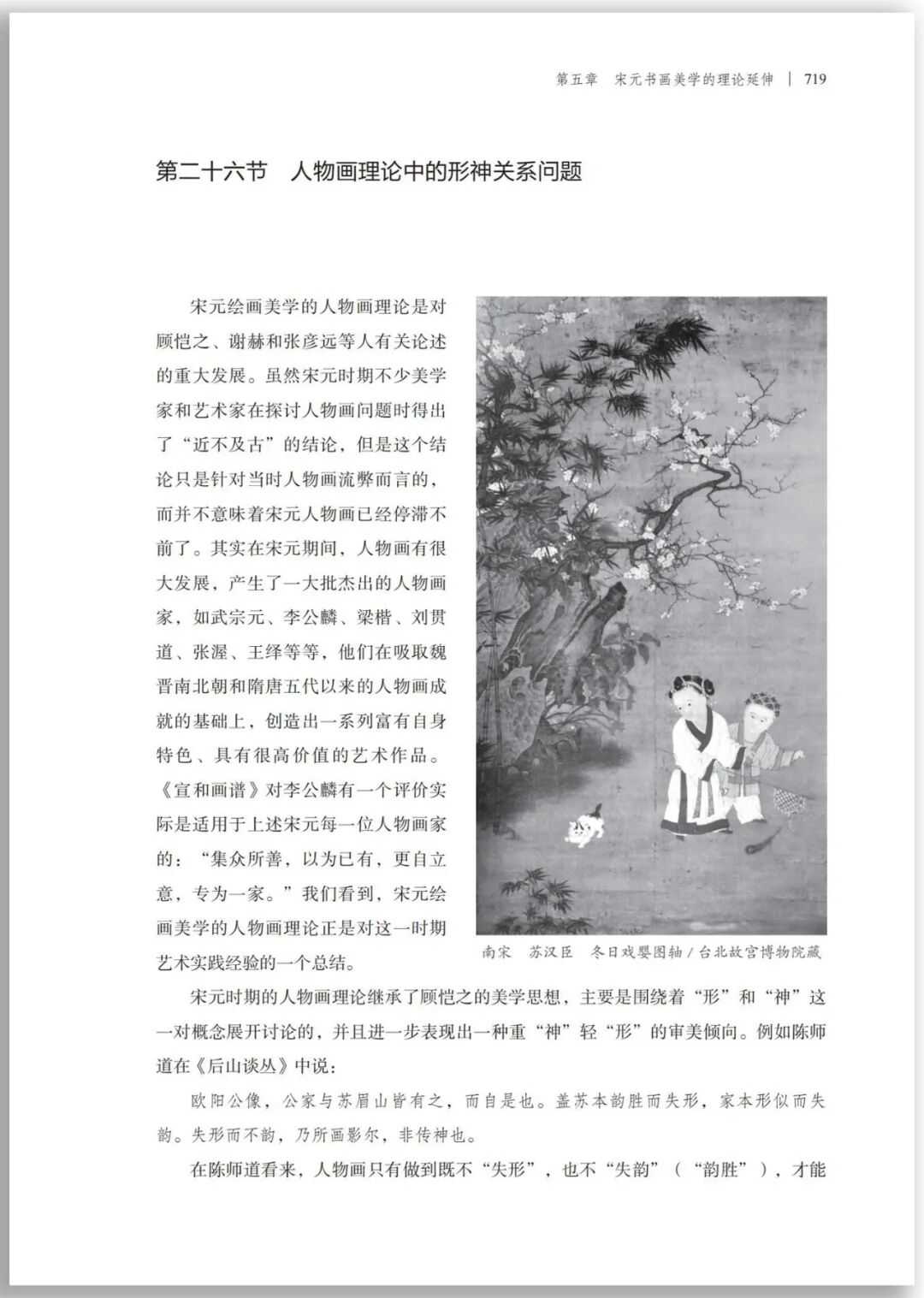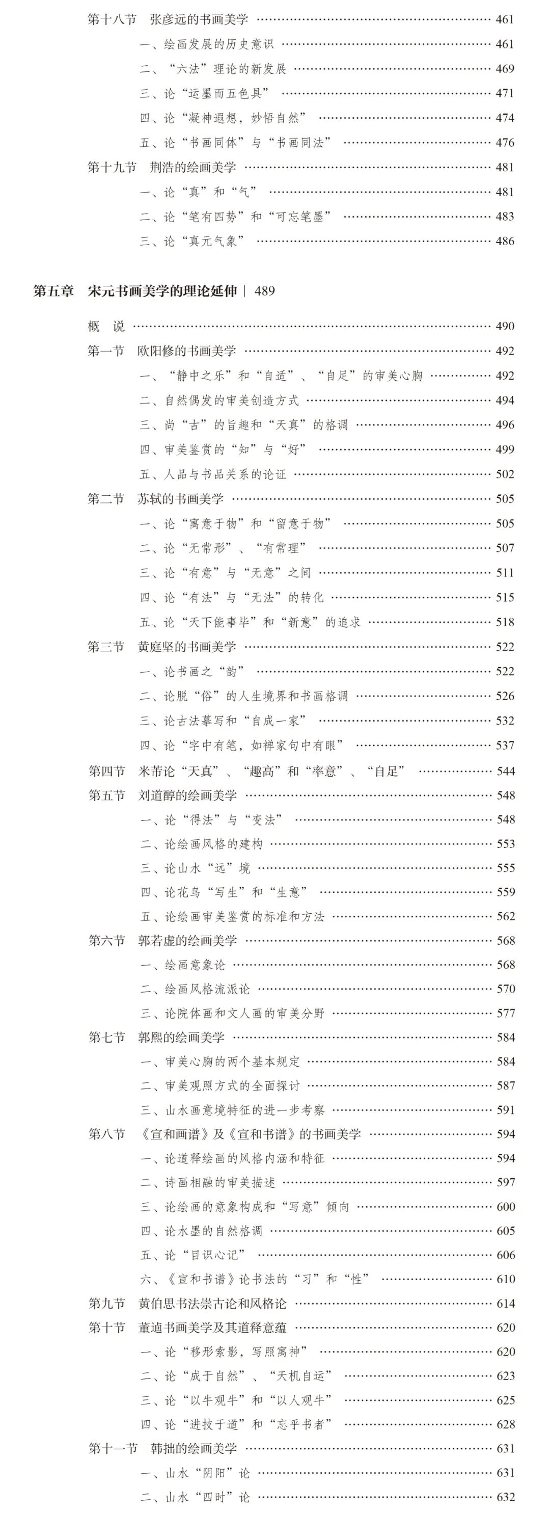 在对六大书画美学历史阶段的深入考察和研究中,作者主要采用了“以人物为中心的叙述和以问题为重点的阐发相交织的两种方式”进行编纂,从而能够突出重点,条分缕析,使该书“史”的叙述更富节奏感。例如在宋元书画美学理论延伸这一章节中,就是围绕着欧阳修、苏轼、黄庭坚、米芾、刘道醇、郭若虚、郭熙、黄伯思等人的书画美学思想进行阐发的,同时对文人画与画工画问题、艺术古今问题、诗画关系问题、常形与常理问题、南北山水等问题展开探讨。这让读者既整体又具体地把握了书画美学发展的历史脉络,又能集中于某个时代书画美学的主要兴奋点。