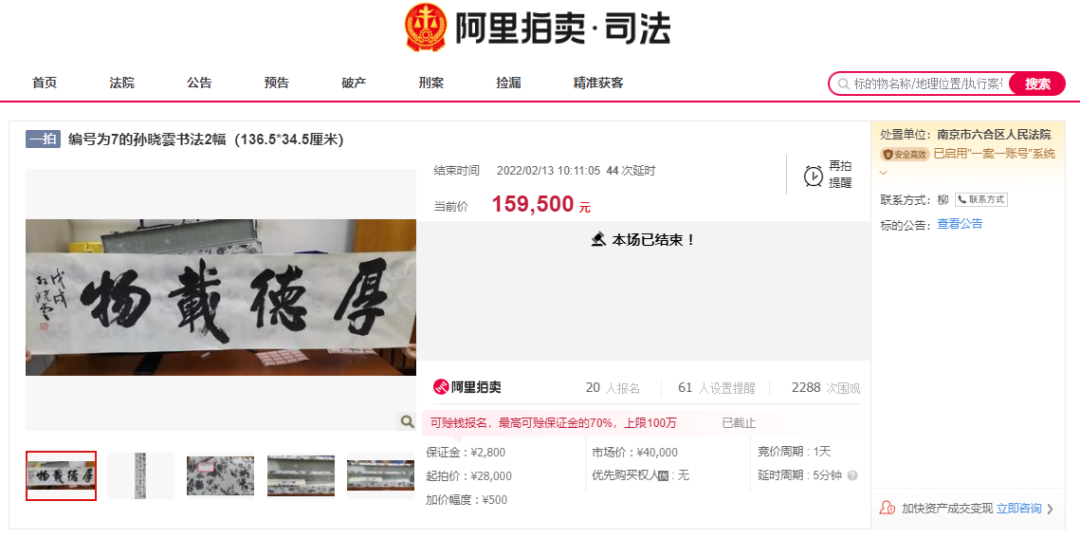 近日,江苏省南京市六合区人民法院在阿里拍卖平台上,对孙晓云书法2幅进行公开拍卖,起拍价28000元,相当于评估价7折。20买家争夺,最终以15.95万元成交,字数不多,差不多“一字千金了”。较起拍价高出469.64%,创孙晓云书法司法拍卖最高成交价。起拍价合计28000元,评估价40000元,相当于评估价7折,保证金2800元,加价幅度500元。按照起拍价,每平尺折合约3301元,公告显示,该两件书法存放于江苏省南京市六合区人民法院,系法院依法扣押,现状处置,瑕疵由买受人自行查验。拍品所有人为夏*寒。20人各自缴纳保证金2800元报名入场。拍卖从2月12日上午10点开始,至13日10点11分结束,经过98次出价,其中44次延时,“R2013”买家朱斌以15.95万元拿下,较起拍价高出469.64%,成交价折合每平尺约1.88万元。此次,法院对编号为7的孙晓云书法2幅(136.5x34.5厘米)进行公开拍卖,按照规格,2幅书法各为约4.24平尺。内容分别为”厚德载物 戊戌 孙晓云 ”(注:戊戌为2018年);另一为朱熹诗,为"半亩方塘一鉴开 天光云影共徘徊 问渠那得清如许 为有源头活水来 朱熹观书有感一首 孙晓云”。