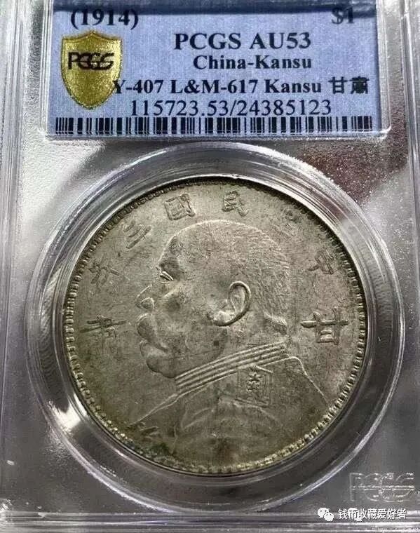 与袁大头银元相同,此币系1930年(民国19年)所铸,但仍沿用民国3年版的旧模,在正面袁像左右加铸‘甘肃’二字,标明是甘肃兰州造币厂铸造,铸额不多,仅数万枚,目前所见之品大都为赝品。该币特征除在正面袁像左右加‘甘肃’二字外,余均与开口贝版相同。![]()