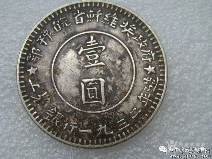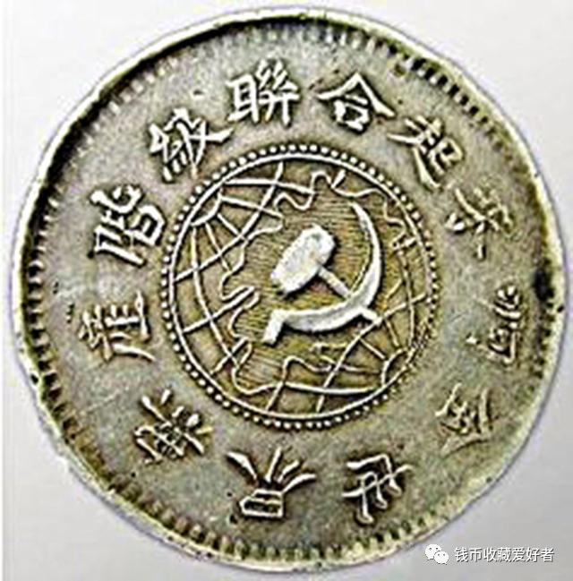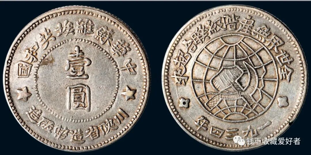 川陕省造币厂1934年铸造。正面中间为一地球,嵌镌空心的铁锤和镰刀,周围有“全世界无产阶级联合起来”和“一九三四年”字样,背面中间为“壹圆”,周围有“中华苏维埃共和国”和“川陕省造币厂造”。![]()