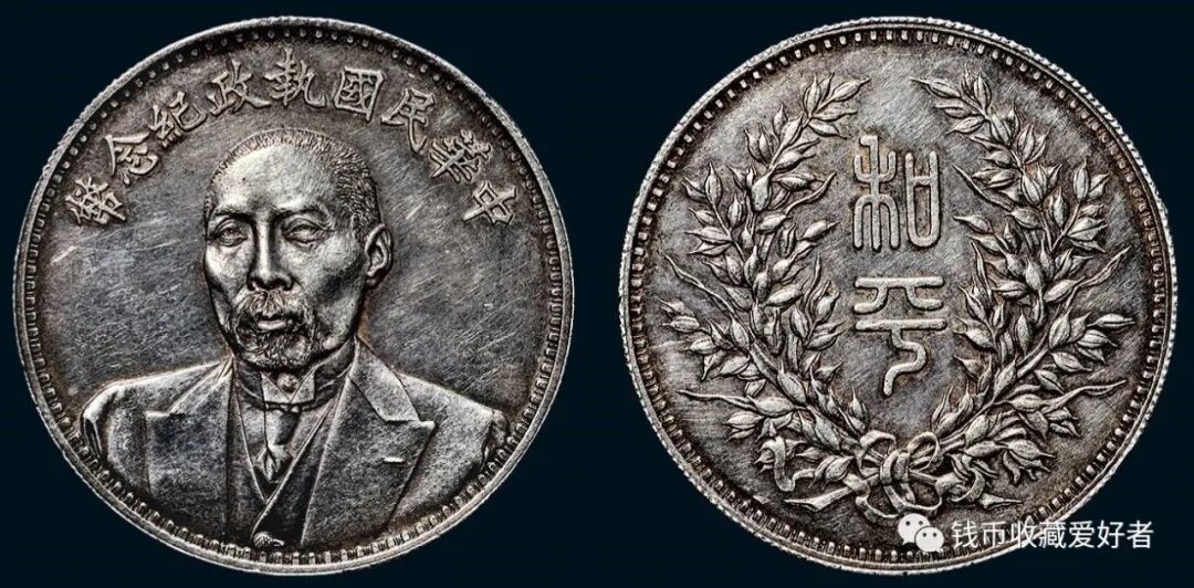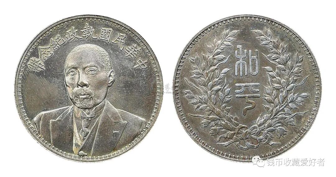 正面为段祺瑞免冠半身西服像,上方“中华民国执政纪念币”,背面有篆文“和平”二字,嘉禾环绕,无面值。![]()