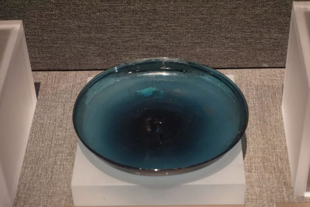 蓝玻璃盘出土于法门寺地宫,呈深蓝色,素面,胎薄莹润,做工十分精妙,一定程度上反映出唐代玻璃制品的工艺水平。![]()