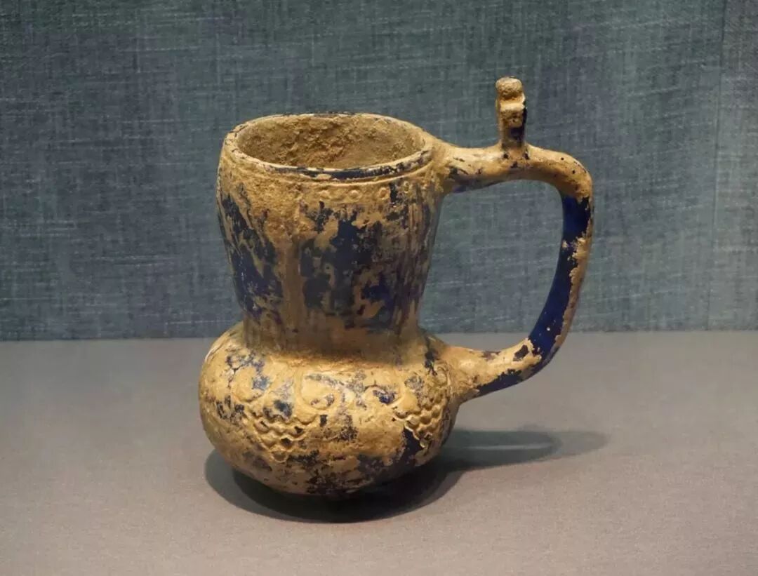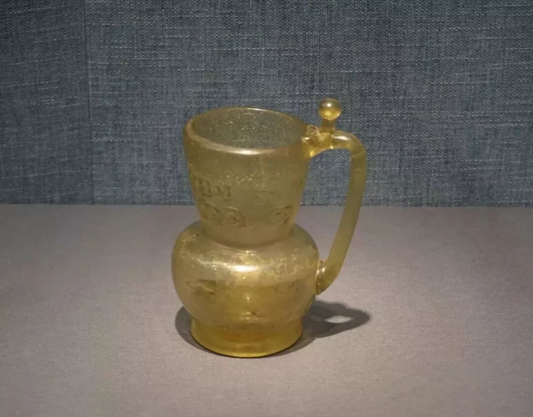玻璃杯呈金黄色,腹部鼓出,晶莹通透;杯壁有圆环、花瓣等纹饰;杯底有圈足。杯把从杯口连接到杯腹,杯把上有同小王力沟辽墓出土的玻璃杯一样的装饰,因此推断其年代为辽代。![]()