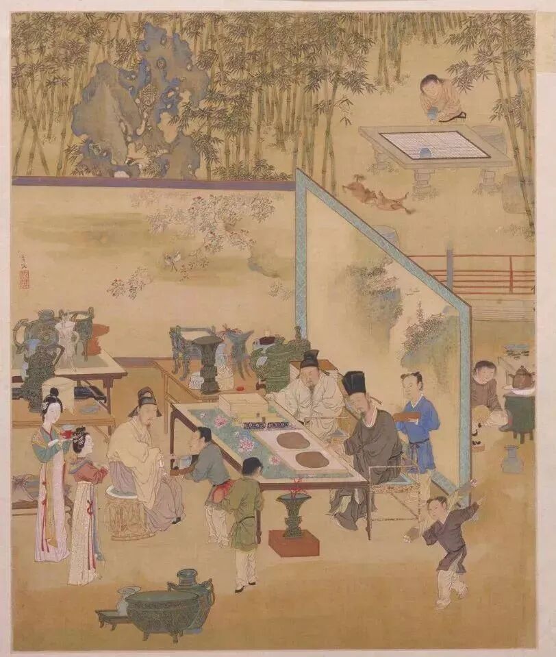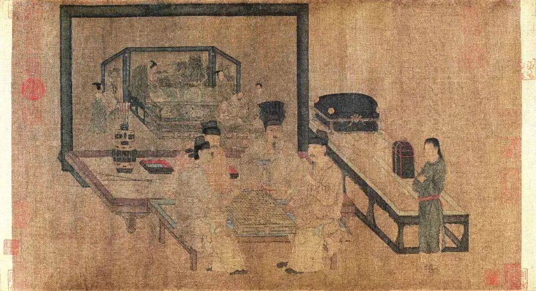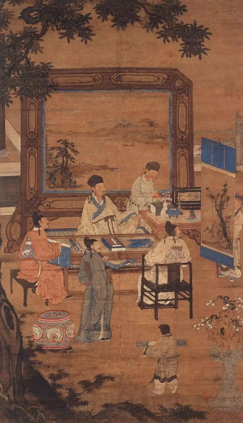 唐代,人们一般坐在床榻,因顾及隐私而采用屏风遮挡,后来渐渐成为一种摆设点缀装饰用。屏风形式多样化,有木制,竹制诸多种类,有的更是镶嵌玉石象牙等,书画屏风只是其中极小的部分。早期的屏风画,比如北魏司马金龙墓出土的漆屏风上。唐代屏风画开始流行,李思训,周昉等画家都画过不少屏风画,周昉《簪花侍女图》就是数块屏风裁下来的。在历代绘画常常看到画里的屏风画,可谓画里有画,宋代,屏风画是最为流行的,这从诸多宋画可以看到。