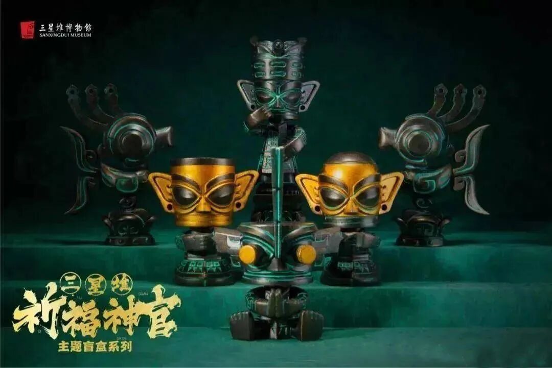 2020年宇宙尘埃文化传播有限责任公司与三星堆博物馆共同推出祈福神官系列盲盒,一经推出在全网热度不减,有“大立人、青铜戴冠纵目面具、带黄金面具的左右护法,还有青铜鸟。