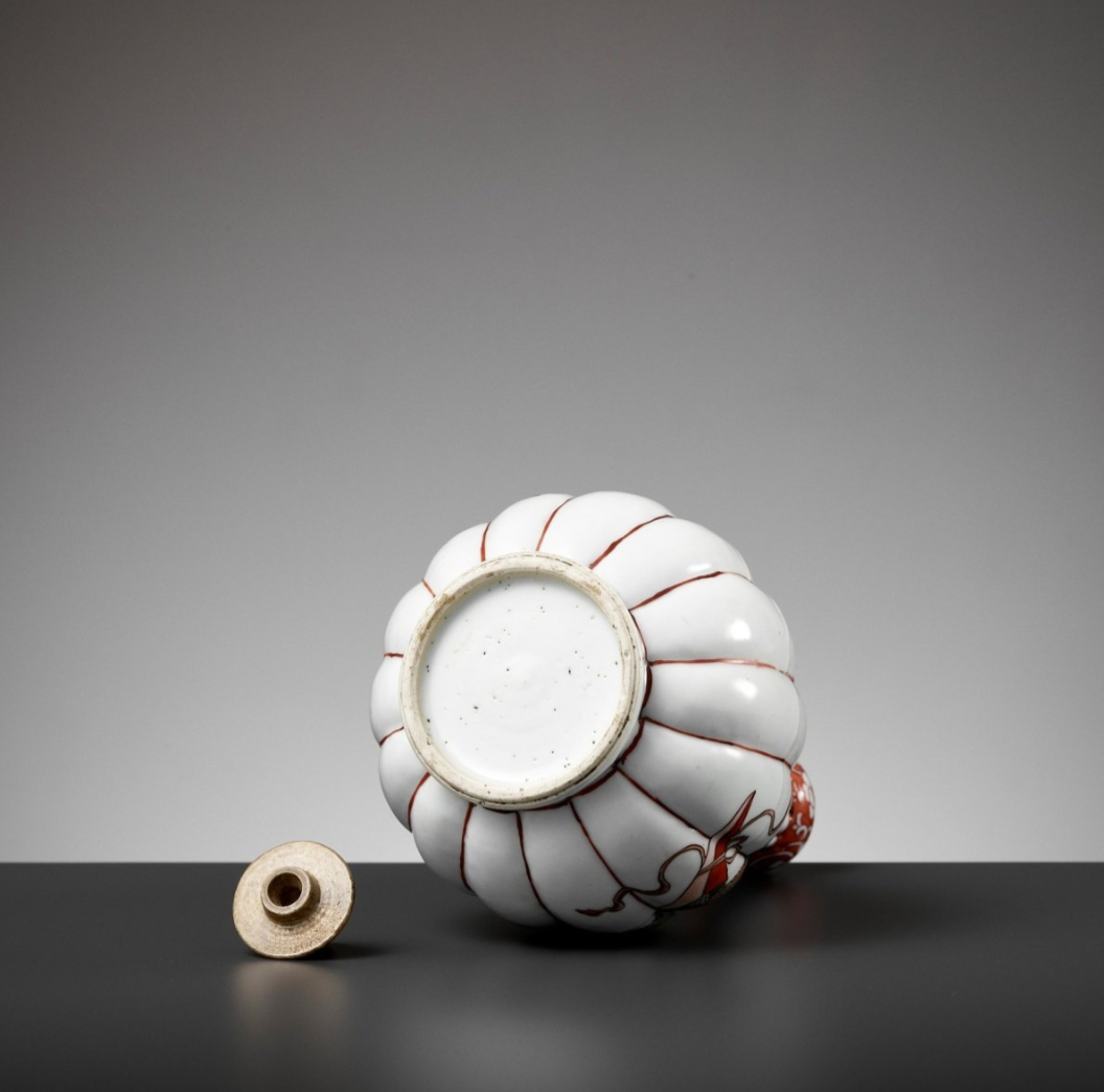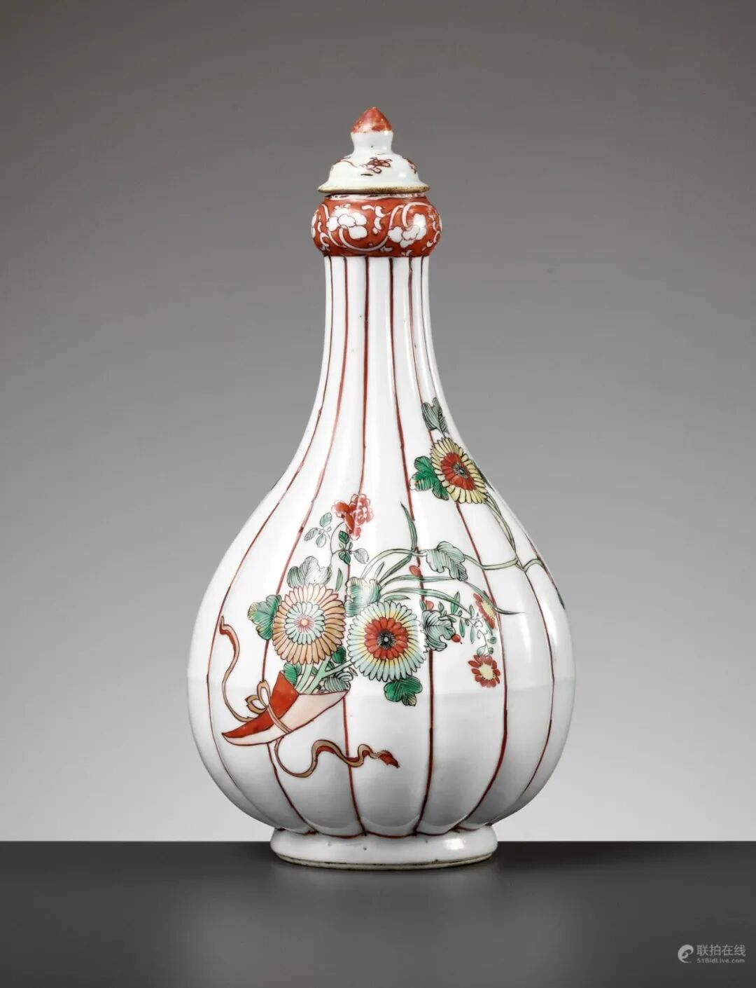 备注:随附一封在瓶中找到的注明为1938年8月20日手写的信。信是用葡萄牙语写的,大致可以翻译成“玛丽亚·爱丽丝!我需要你帮我一个大忙。由于正在建楼,我很遗憾他们打破了这个瓶子。它已经有一个多世纪的历史了,这是塞莱斯特(Celeste)送给她父亲的礼物,感谢他帮助她的堂兄菲洛门那(Filomena)。非常感谢,施韦斯特·玛莎,里斯本,1928年8月20日”。蒜头形口,缠枝花纹;棱线内凹,溜肩,圆形腹,采用凹凸棱线相间装饰,圈足。瓶身施明亮的珐琅并金彩,描绘盛开的菊花花束,线条流畅。