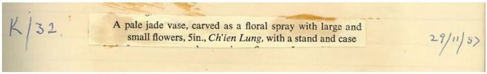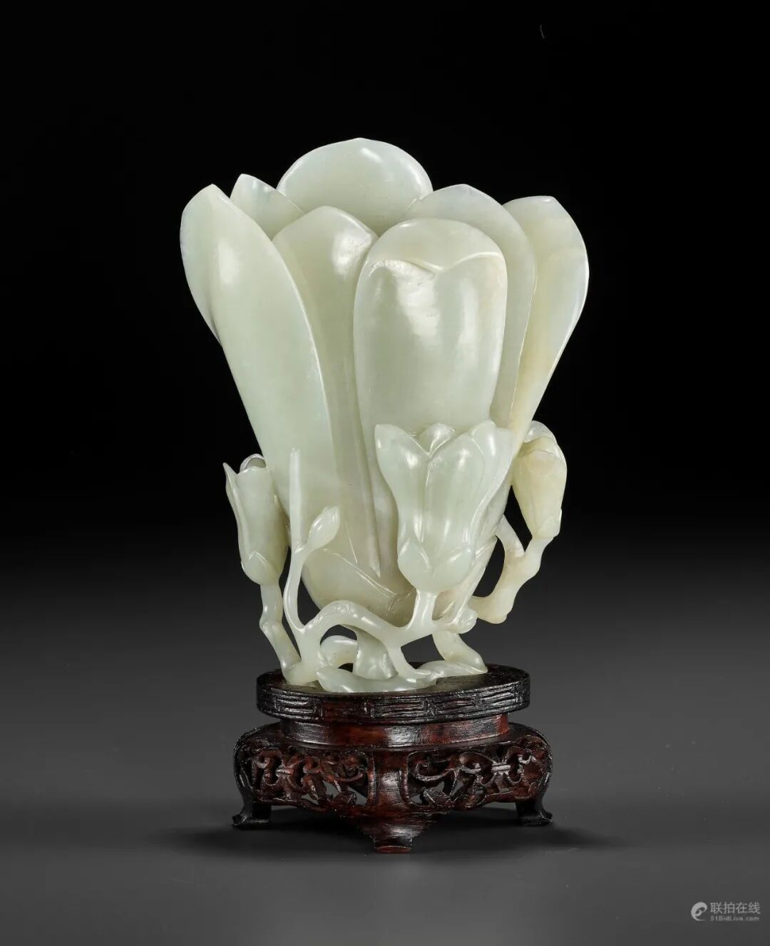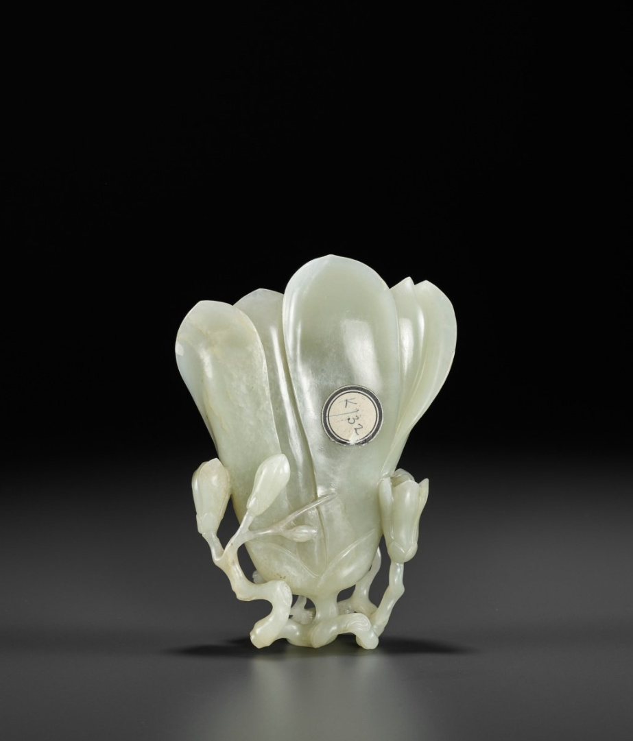 尺寸:高 11.8 厘米 (不含底座),总14.5 厘米来源:Ezekiel 收藏,编号 K/32(花插一面可见标签)。Victor Ezekiel 购于1957年11月29日。备注:随附一份 Victor Ezekiel 打字并手写注释的文档副本,上面可见他的购买日期和收藏编号,并将此器描述为 “青白玉花插,雕刻成花状及大小不一的花蕾,5英寸,乾隆,带底座和盒子。”花插主体为一朵初放的玉兰花,花瓣层叠,富有层次感,花口做花插,玉兰花四周雕有几朵大小不一的花蕾花苞。底部透雕成的枝杈盘结,整体色泽由底部的青向上渐次变白,色泽莹润清新。花插整体造型惟妙惟肖,寓意“玉树临风”。Ezekiel 收藏由Marcus Ezekiel(左图)和他的儿子 Victor(右图)创立,他们曾是20世纪上半叶伦敦的中国艺术收藏形成及稳定时期的两位领军人物,同时也是东方陶瓷学会早期重要成员。本拍品随附一份 Victor Ezekiel打字并手写注释的文档副本