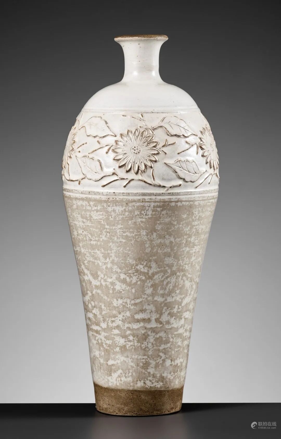 来源:德国北部私人收藏,从上世纪七十年代起在同一家族保存至今。老标签“50/0219”,用棕色墨水所写。口细而颈短,丰肩,下收、圈足的立式。瓶至胸部,施白色化妆土,浅雕花卉卷叶纹,边缘变薄,肩部以下至足部有略微不均匀的线条。边缘和凹陷的底部露浅黄色胎。