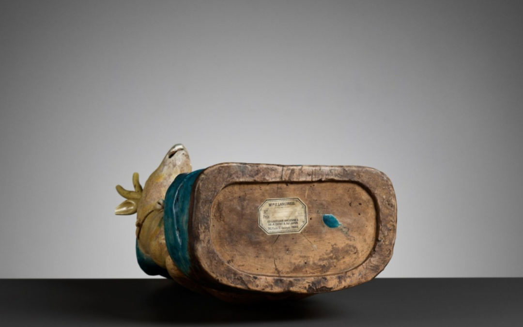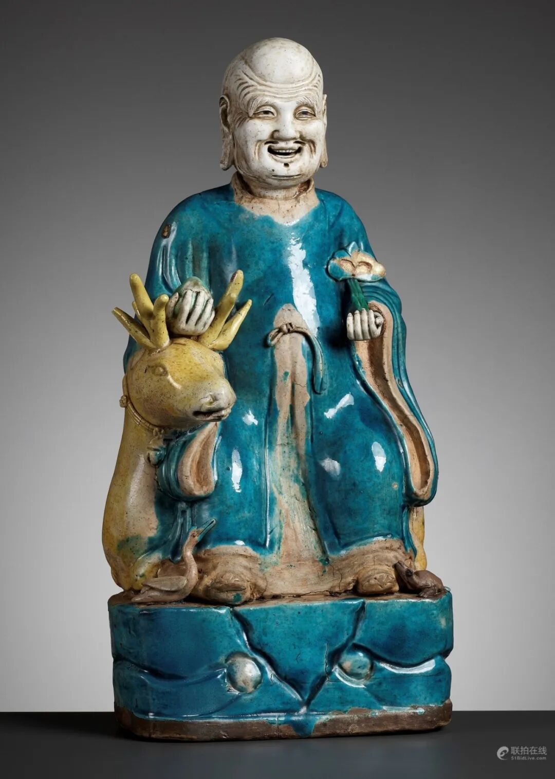 来源:根据底座标签显示为 Madame Florine Langweil (1861-1958)收藏。Yves Montand 可能购于上述收藏,保存至今。寿老坐在仙鹿上,右手拿着桃,左手拿着如意,穿着宽袖长袍。脚边卧著一只小鹤和龟,仙鹿杏仁状眼睛,戴着一个有铃铛的项圈。寿老额头宽大,长耳垂,笑容盈盈。长袍和仙鹿上覆盖着松石绿与黄色釉,其他部位没有上釉。Yves Montand(1921-1999)曾是世界著名的意大利-法国演员和歌手。原名 Ivo Livi,出生于托斯卡纳,1923 年全家因法西斯政权离开意大利,在法国马赛长大。1944年,他在巴黎被 édith Piaf 发现,并参与了她的表演。Montand 获得了国际范围内的认可,并出演了许多电影。图为 Montand 与玛丽莲·梦露的合影。