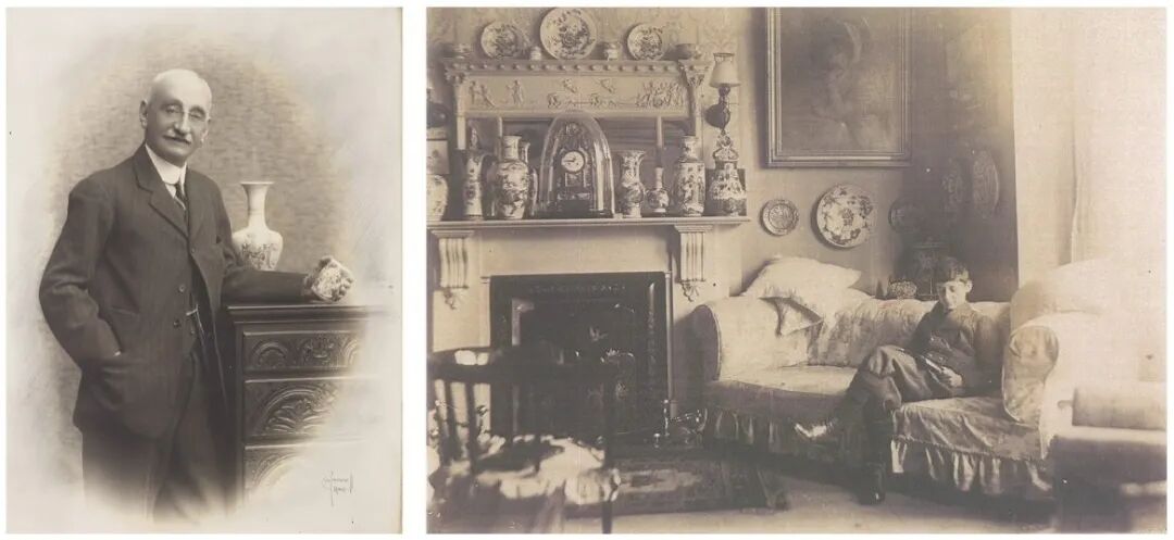 1.Professor John Norman Collie(1859-1942)曾是一位英国科学家、登山冒险家。2.Henry Tozer 是一位亚洲艺术的爱好者。他的收藏中有唐代陶器、早期中国青铜器、晚期瓷器、玉雕和日本版画。1942-1958 年间,他曾是 Bluett 艺廊的常客。玉料被雕刻成一片叶子,中间有一个椭圆形的穿孔,一只大螭龙,尾巴分叉,耳朵呈漏斗状,大大的眼睛在叶子上攀爬并缠绕穿过穿孔,望向正趴在叶子边缘的幼崽 。半透明的石料呈灰色调,带有浅棕色的斑块以及黑色的纹理和斑点。Una Pope-Hennessy 在她1923年出版的《Early Chinese Jades》一书中认为此挂件应为唐代或更早。Norman Collie(图左)与 Victor Ezekiel(图右)出版:Una Pope-Hennessy,《Early Chinese Jades》(中国早期玉器)