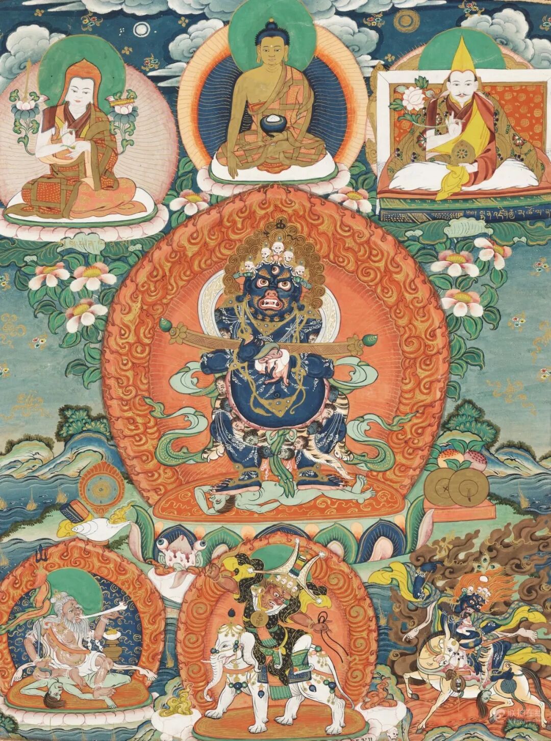 尺寸:画面51 x 38.5 厘米,总113 x 72 厘米来源:Herbert V. Guenther 私人收藏,受赠于不丹国王,自此保存于同一家族。愤怒相护法神双脚踩在恶魔上,身后有燃烧的火焰光背,手里拿着嘎巴啦碗和匕首。在他的前臂上托著一根甘地棒。在他上方坐着释迦牟尼佛,两侧是第十三世达赖喇嘛和一位佛教大师,在他下方是其他神像,包括吉祥天母和白哈尔神,并有款识。HerbertVighnantaka Guenther(1917-2006)是一位德国佛教哲学家和学者,他于1950 年移居印度,并在那里生活和教书直到1964年。1958年至1963年间,他前往瓦拉纳西的梵文大学担任比较哲学和佛教研究系主任。Guenther 有幸与许多著名的西藏和蒙古喇嘛一起学习,甚至拜见了第三代不丹国王晋美·多吉,并从他那里受赠了唐卡作为礼物。