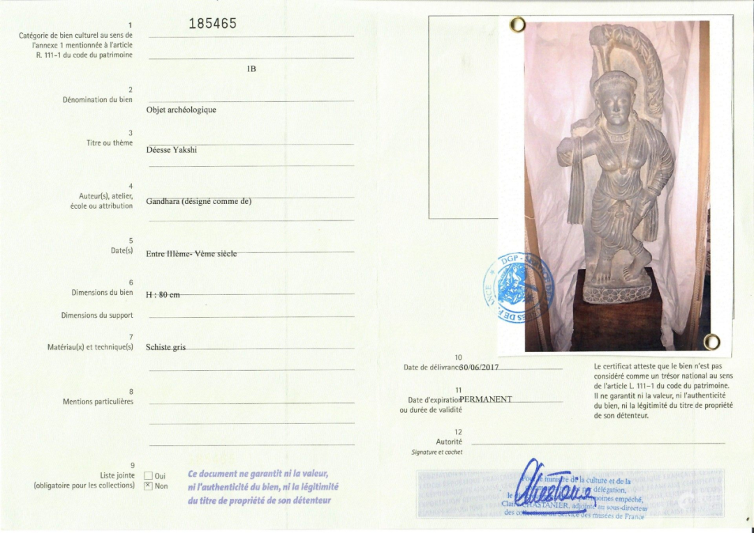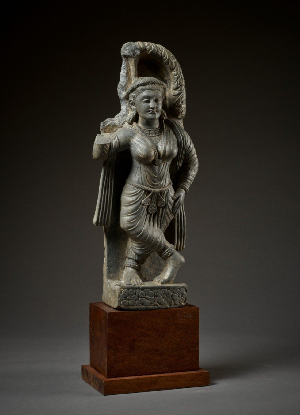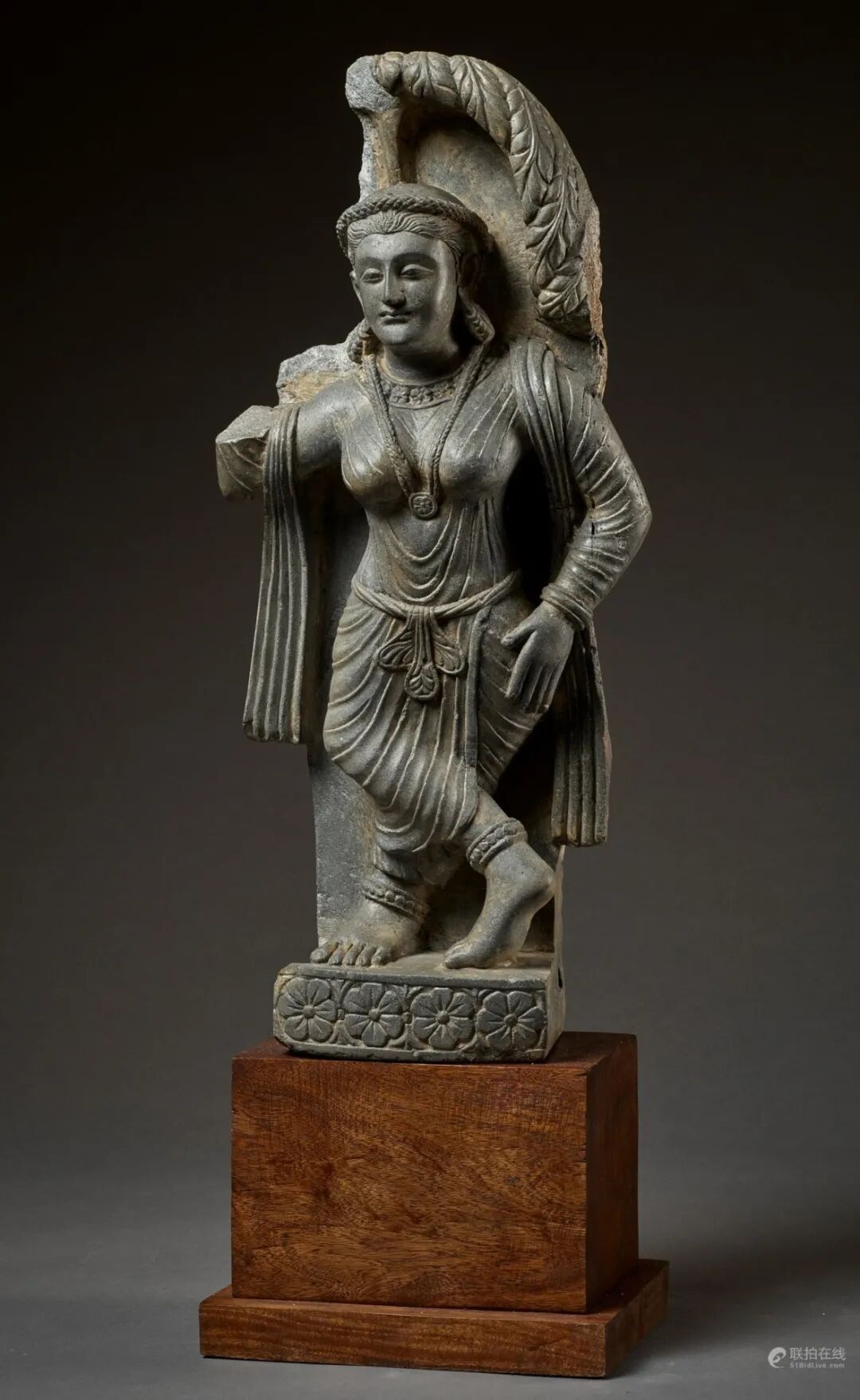 来源:Arthur Huc(1854-1932)收藏。Marcel Huc 继承,自此保存在同一家族至今。1.1954年,图卢兹法院法警 L. Magniette 奉命对 Marcel Huc 从其父亲 Arthur Huc 继承的收藏品进行完整目录汇编,即所谓的“Inventaire Huc”。此拍品也在当时列出的收藏清单中“ Serie de vingt deuxtêtesen terre-cuite。GANDHARA”(二十二个陶土头像系列,健陀罗)。随附清单和封面副本。2.随附2017年6月30日出具的 Certificat d’exportation pour un bien culturel 证书,编号 185465。药叉女双腿交叉站立在刻有玫瑰花纹的方形底座上,左手支撑腰部,穿着精致的百褶纱丽,缀有串珠,宁静的脸庞,杏仁状的眼睛,丰满的嘴唇 ,脸部两侧为戴着花朵耳环的细长耳垂,卷发。Arthur Huc 不仅是法国图卢兹报纸 La Dépêchedu Midi 的主编,也是一位出色的艺术评论家,以及 Henri de Toulouse- Lautrec 等艺术家的早期赞助人。Arthur Huc 同时是一位热衷于亚洲艺术的收藏家,他的热情源于他的传奇祖先 évariste Régis Huc,中文名为古伯察(1813-1860),是法国天主教神父和旅行作家,在他的《鞑靼西藏旅行记》书中描述了他在清朝的游历以及对蒙古尤其是当时几乎鲜为人知的西藏叙述。本拍品随附 Certificat d’exportation pour un bien culturel 证书