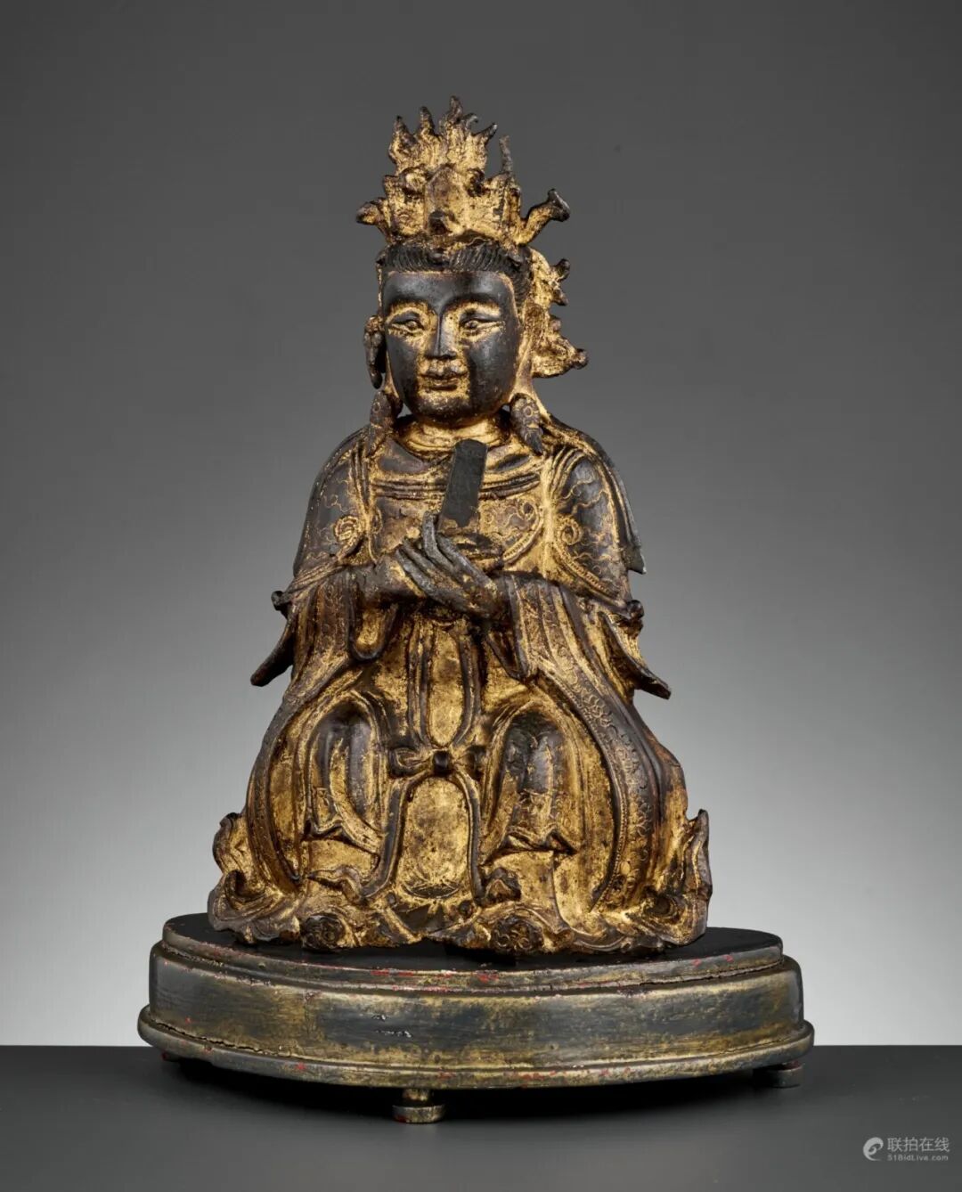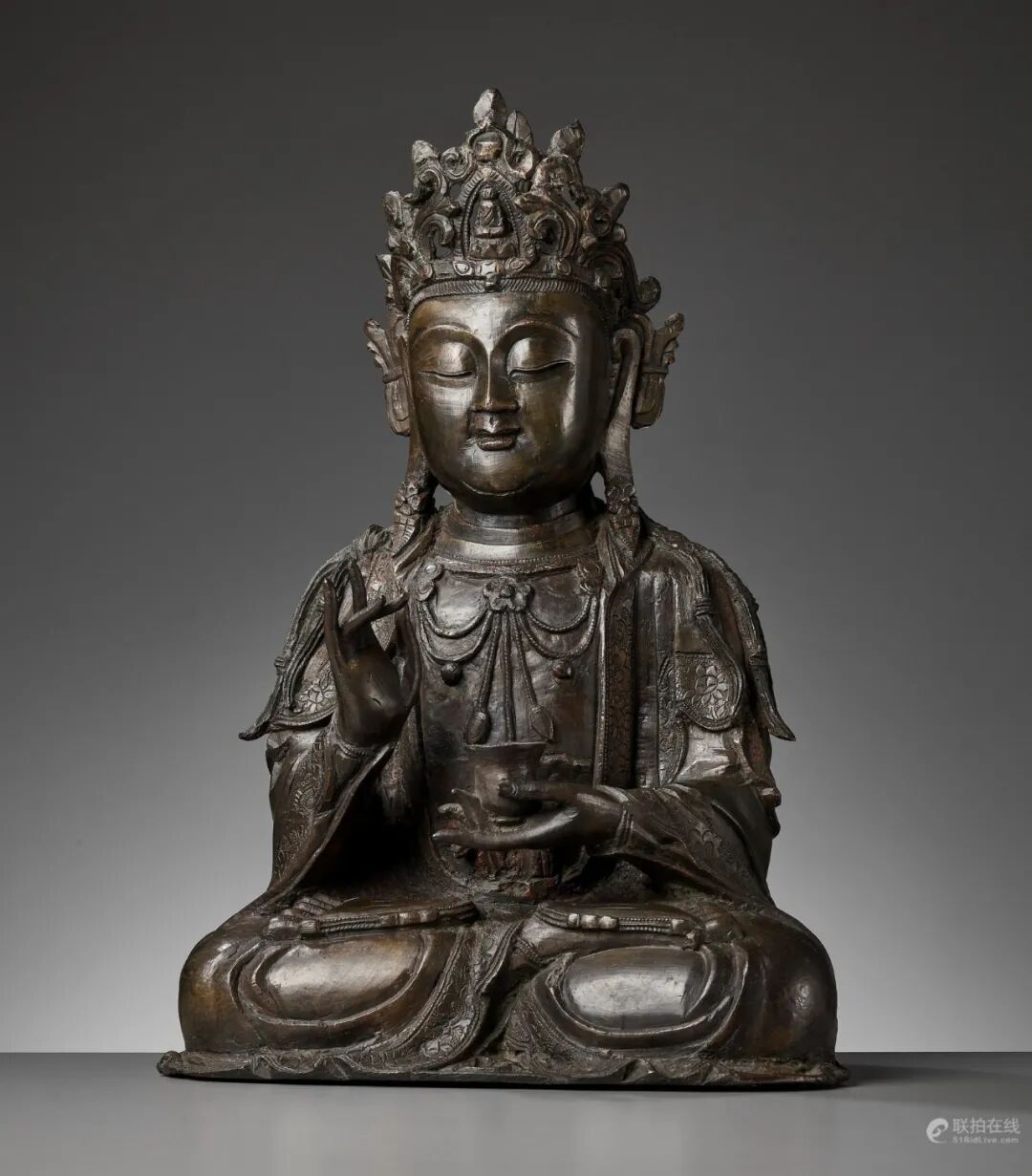出版:维也纳 Zacke 艺廊 《佛教及印度教造像》,1985年 (描述为明代中期)。来源:维也纳私人收藏,1985年购于 Zacke 艺廊。底部可见艺廊标签“Foto 285/12”,自此保存在同一家族至今。观音呈坐姿,顶严梳髻,上承宝珠,辫发横垂两肩。头戴花冠,花冠正面中央安化佛。高额宽广,双目下视,双唇轻抿,嘴角微扬,面容庄严慈悲。上半身披通肩天衣,颈胸垂挂璎珞,衣褶流畅自然,褶镌刻缠枝花卉纹,并饰连珠纹。观音左臂内屈,悬空置于腰脐,掌心向上,手托净瓶。右臂高举当胸,拇指与中指并撚持杨枝。下半身内著高腰长裙,裙缘垂地,结跏趺坐,具有超凡脱俗与高雅圣洁的崇高丰姿。出版:维也纳 Zacke 艺廊 《佛教及印度教造像》
