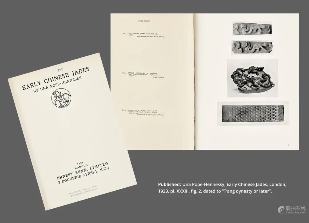 出版:Una Pope-Hennessy,Early Chinese Jades(中国早期玉器),伦敦,1923年,pl. XXXIII, 图2。来源:Professor J. Norman Collie收藏。伦敦苏富比1943年4月 9日lot 303;Henry Tozer 购于上述拍卖;伦敦苏富比1960年7月26日lot 118;Victor Ezekiel 购于上述拍卖。