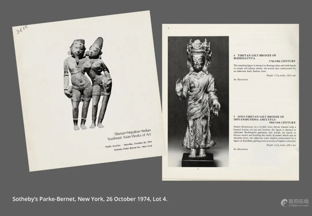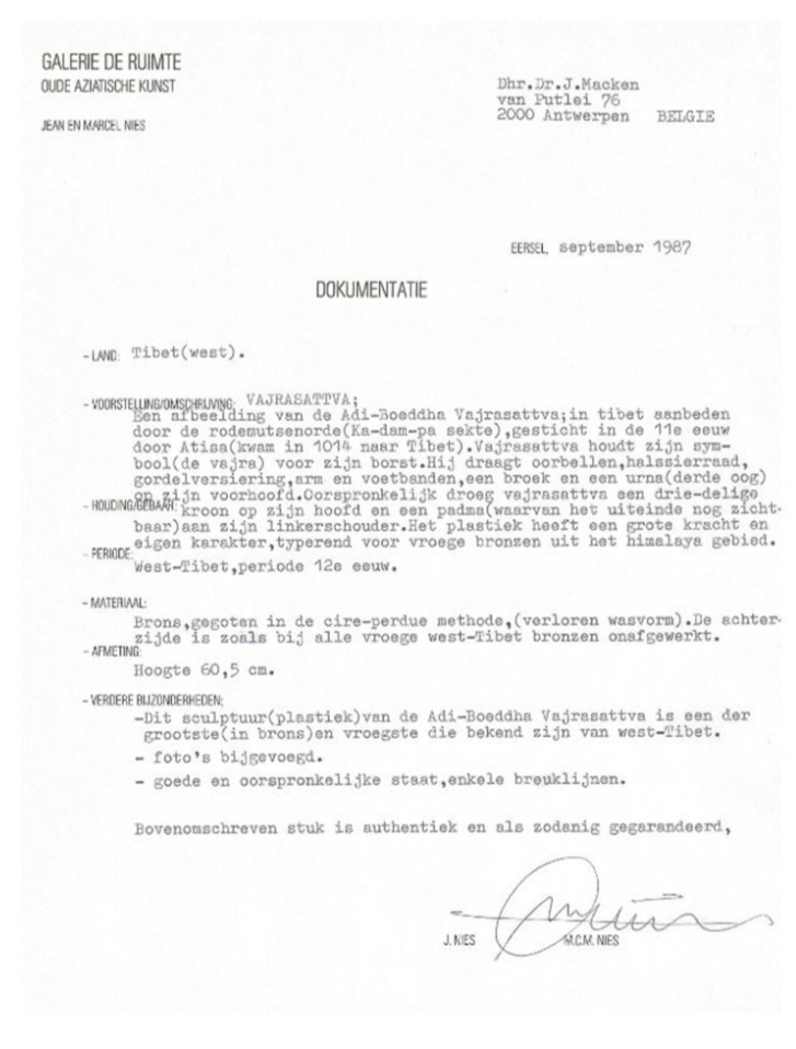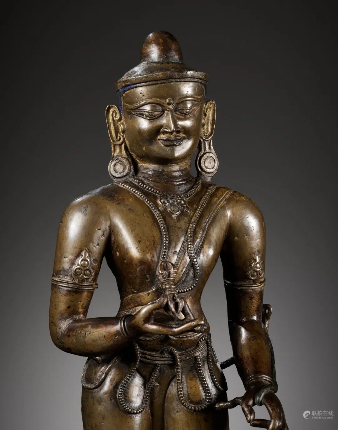 来源:比利时安特卫普 Dr. J. Macken 收藏。备注:随附一份亚洲艺术艺廊 Galerie de Ruimte Marcel Nies 签名的证书,收件人为 Dr. J. Macken,确认了其制作时期。呈三区姿势,右手握金刚杵,左手握莲茎,在肘部形成一个小圈。他那透明的长袍被一条缀满了珠饰的腰带系着。金刚萨陲面容安详,眼睛呈杏仁状,优雅的眉毛,眉间白毫,丰满的嘴唇,脸庞两侧是修长且突出的耳垂。公元10世纪末至11世纪初叶,西王、译者仁钦桑波、印度圣贤阿底峡等第二次在西藏传播佛教,此时期的青铜造像极为罕见。这个例子因其存在和造型引人注目,而且尺寸硕大,极具有冲击力。Marcel Nies 是比利时艺术专家和经销商,专营东南亚、印度和喜马拉雅地区的重要艺术品。他自1975年开始为全球众多协会提供建议。除了在他的画廊所举办的年度展览外,Marcel Nies 参加 TEFAF Maastricht 已有 30 多年,展示他收藏中的精品。他也为阿姆斯特丹国立博物馆、德国科隆东亚艺术博物馆、伦敦 Victoria and Albert Museum 博物馆等诸多重要博物馆提供艺术品。本拍品随附的一份来自亚洲艺术艺廊Galerie de Ruimte 由 Marcel Nies 签名的证书