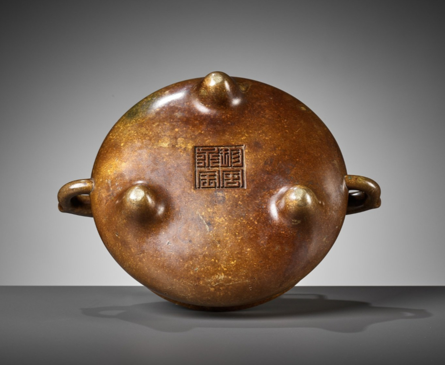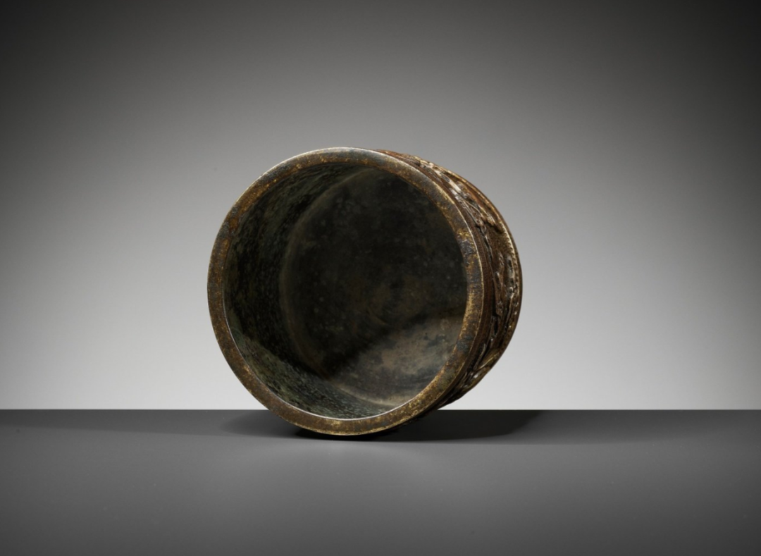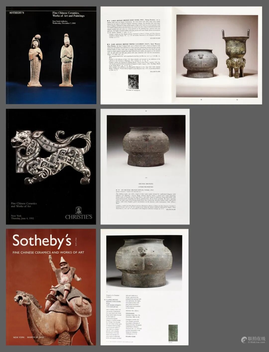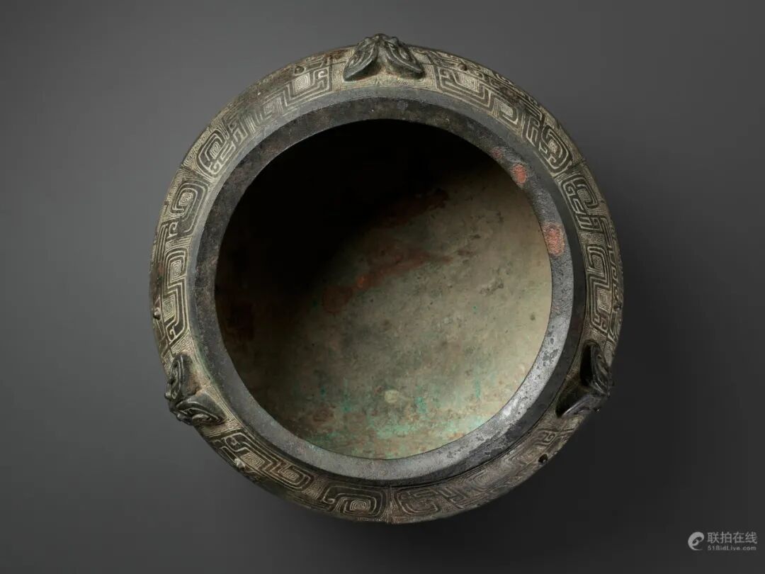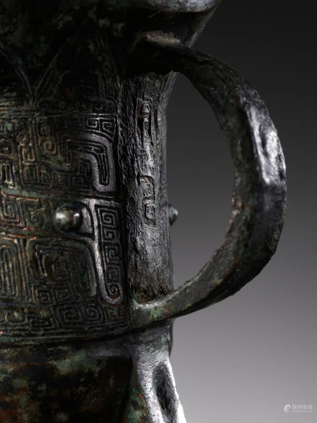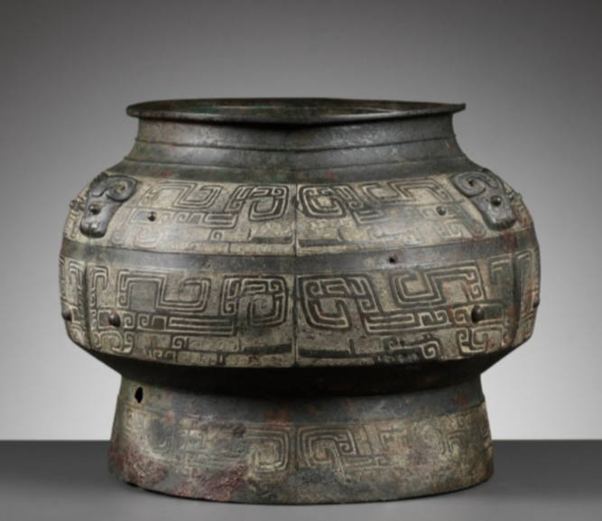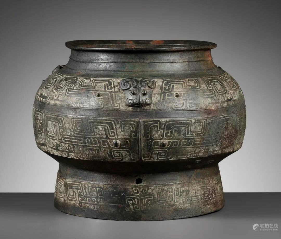 来源:纽约苏富比 1983年12月7日 lot 49;纽约私人收藏,购于上述拍卖;纽约佳士得 1992年6月 4日 lot 179;加拿大私人收藏,购于上述拍卖;纽约苏富比 2002年3月20日 lot 18;一位知名收藏家,购于上述拍卖。饕餮纹青铜瓿,圆腹,敛口,圈足上有三个方形孔,流行于商早期至商晚期前段,为古代盛酒器。中央清晰可见三个饕餮纹,饕餮一对炯炯有神、不怒自威的巨目;其下方是夔龙纹;整器以雷纹为地。本瓿以体型大、造型庄重而著称,是商代下半叶(公元前 约1600-1046 年)青铜器皿的典范。受新石器时代陶瓷原型的启发,这种器皿出现在二里岗期末期(约公元前 1500-1300 年),用作祭祀礼器,消失于西周初年(约公元前 1046-771 年)。