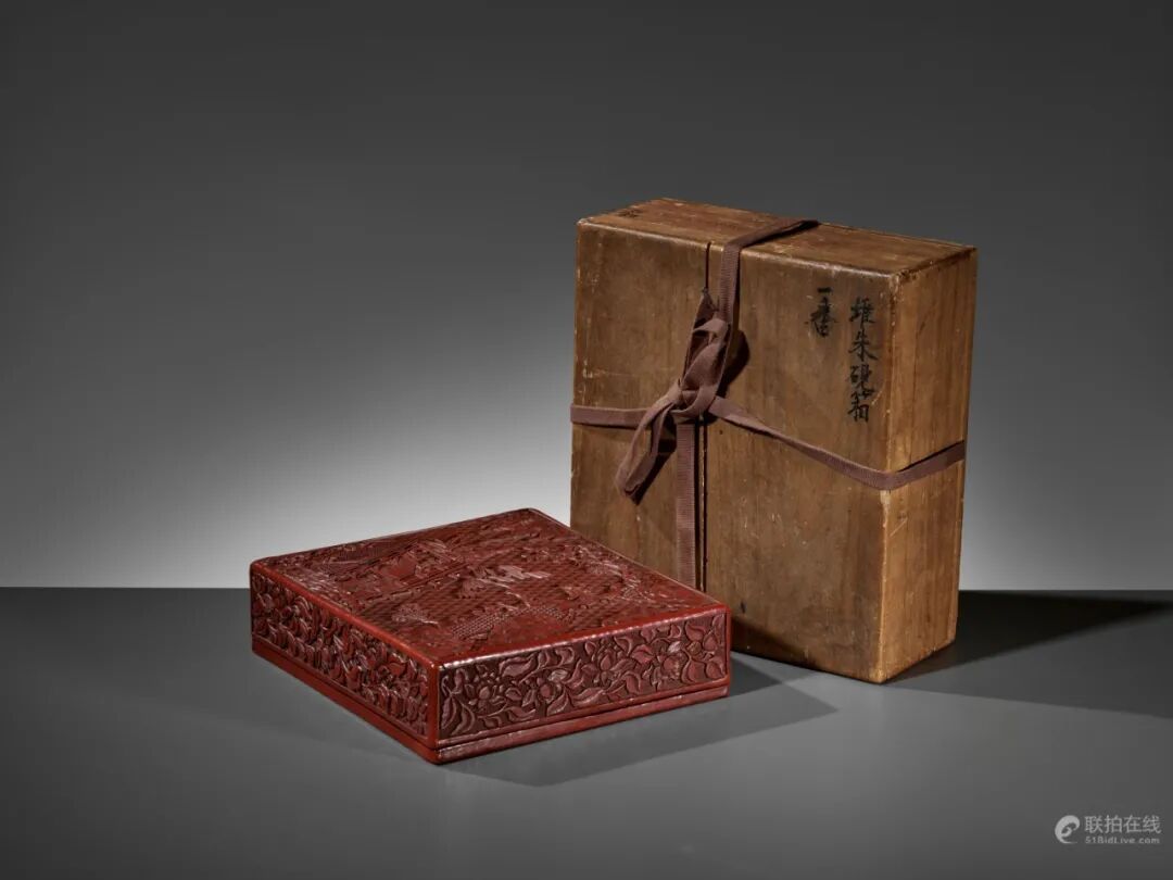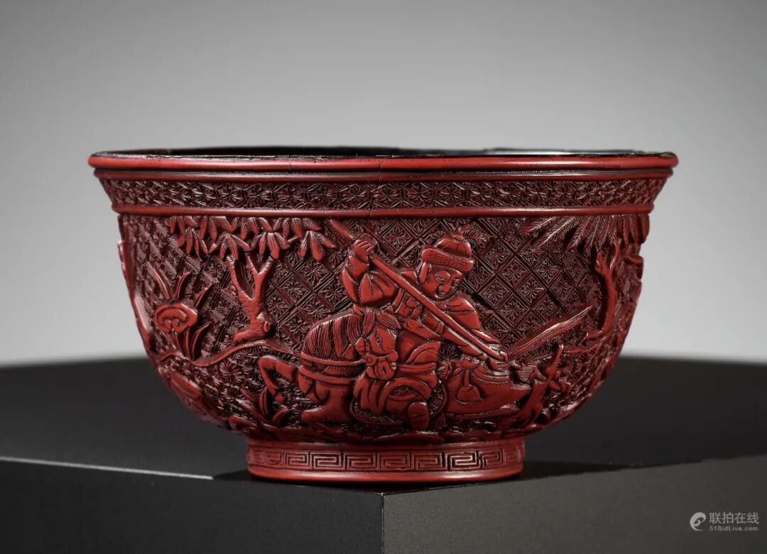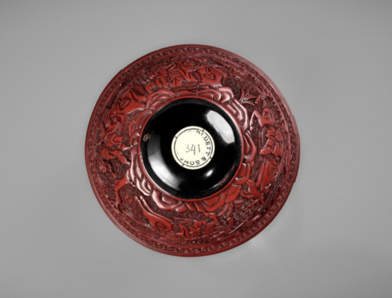 来源:北京 W. F. Collins (1865-1948) 上尉。伦敦 Bluett & Sons 艺廊,1926年5月26日。伦敦 Parry Collection 中国艺术收藏,购于上述艺廊并保存至今。1.底部可见收藏老标签“341”,Bluett & Sons 的标签局部被遮盖。2.随附 Bluett & Sons 艺廊出具的盖章发票副本,时间为1926年5月26日,收件人地址为 “E. A. Parry, Esq.”。发票上注明此拍品为明代。3.Collins 上尉在1925年2月至198年1月期间曾是 Bluett 在中国的主要供应商。他还在1920年代至1940年代期间向 John Sparks 和伦敦以及巴黎的其他经销商出售艺术品。剔红碗撇口,直壁深腹,大气端庄,通体髹红漆。外壁锦地剔红装饰狩猎场景,山石松树掩映。蒙古服饰人物骑于马上手持兵器围猎,为首之人立于马上持戟杀狼,一人持鞭催马。马匹身姿矫健,四足腾空。猎手神情严肃,对猎物志在必得。整器风格古朴雅致,乃明代剔红典雅之作。描绘狩猎场景的漆碗极为罕见。明初皇帝继承了元代蒙古人的狩猎传统并将其视为军事实力和国家权威的标志。但到了明中后期,文人将狩猎视为国家政治的昏庸,因此出现了激烈的对抗,明朝皇帝和文人集团之间争夺统治权。根据明清时期文字记载,周柱制百宝嵌,有嵌于硬木、嵌于漆器两种,当时人称“周制”。他能够巧妙利用宝石与其他材料本身的特殊性,创作了很多生动的场面,他的技术被称为“吴中绝技”,清代阮葵生《茶余客话》记:“周柱治镶嵌……名闻朝野,信今传后无疑也。”Parry 收藏是英国重要的御制珐琅器、漆器、瓷器和玉器私人收藏。1919年,贸易法大律师 Edward Arthur Parry(1879-1946)和他的妻子 Angela Parry(原姓 Scully,1879-1977)开启此系列藏品的积累,他们有六件藏品曾在国际中国艺术展览会上展出,证明了其收藏的极高品质。Parry 收藏已经在该家族传承了三代人,其中许多藏品都是从著名的伦敦经销商 Spink & Bluett's 那里购得。